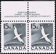 It is to be noted that the design of the Gannet was taken from the Canadian stamp Sc343 (15-cent Grey, Northern Gannet or Morus Bassanus in flight, issued on 1 April 1954).