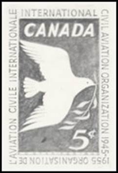 The resulting design was redrafted by Mr. St.Onge (see second draft), to avoid presenting too many similarities with the Canadian stamp Scott #343 (Northern Gannet in flight); it is to be noted that the word organisation was spelled in English with the letter S (British spelling), which was an error as ICAO's official name had always been spelled with the letter Z.