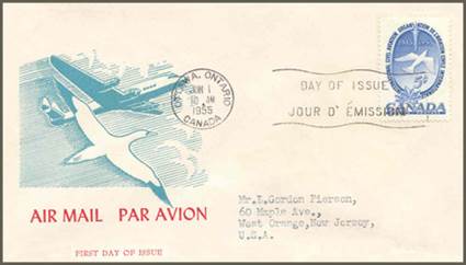 Jacoby Type A cachet; Medium Turquoise and Red; Lockheed L-1049C Super Constellation; Northern Gannet or Morus Bassanus in flight. Cancel at London, Ontario. (See footnote 4)
