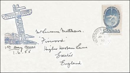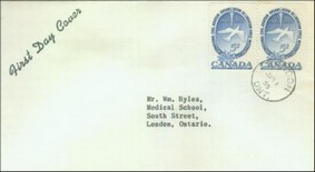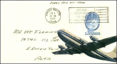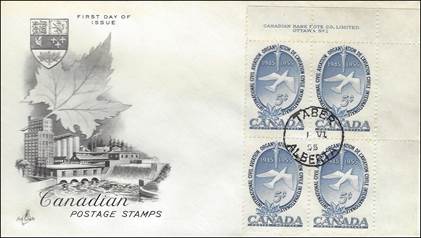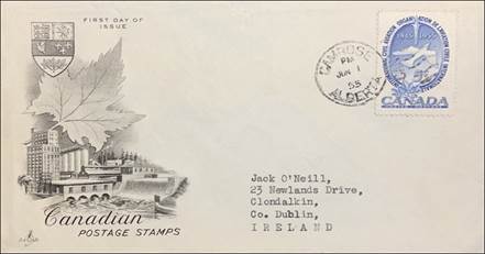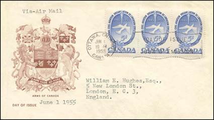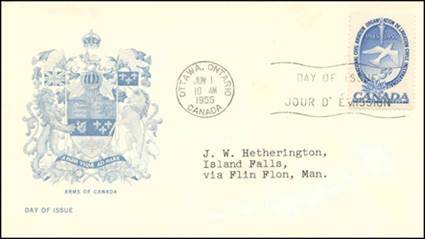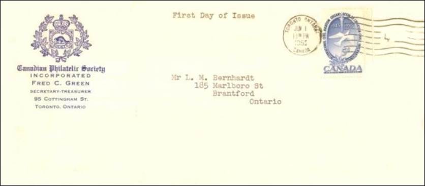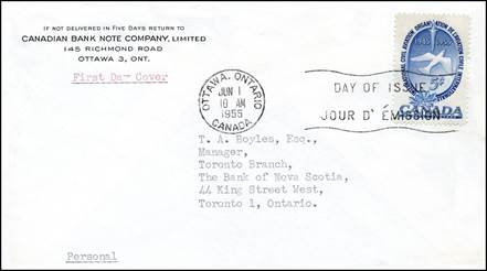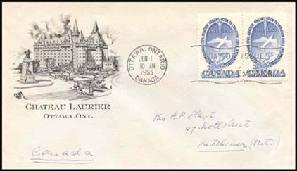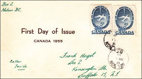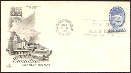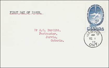These covers with the aircraft and gannet flying in tandem were already in use since the issue of the Canadian 15-cent stamp showing the northern gannet on 1 April 1954. See below.