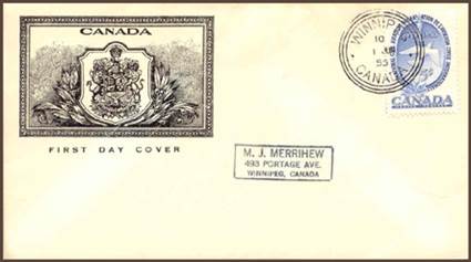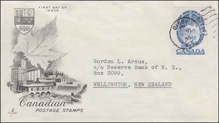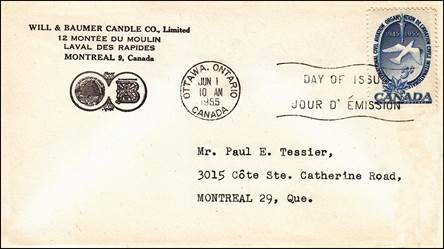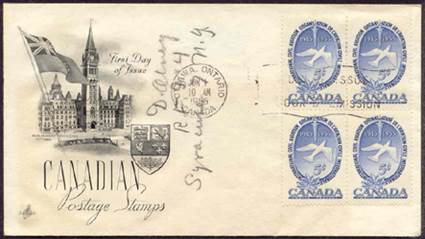 Caneco Envelopes Company cachet. Cancel at Place d’Armes, Montréal, Québec. Autographed by Walter Loshe, designer of the stamp.