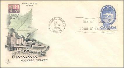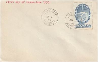 However, as compensation, the suggestion made by the Post Office to issue a commemorative stamp was positively received at ICAO; a stamp could be considered for the 10th anniversary of the inception of the Organization in August 1955, rather than the tenth anniversary of the Provisional Organization's installation in Canada (June 1945). It was later suggested that the first day of issue coincide with the second day of ICAO's 9th Session of the Assembly, i.e., 1 June 1955.