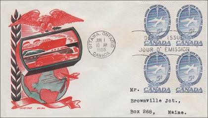 Jacoby Type B cachet (no dates 1945-1955); Medium Turquoise and Red; Lockheed L-1049C Super Constellation; Northern Gannet or Morus Bassanus in flight. Cancel at Ottawa, Ontario. (See footnotes 4 and 17)