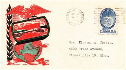 One-of-a-kind cover. Philatelic Supply multicoloured cachet with additional art embellishments. Cancel at Kitchener, Ontario. On the recto, a blue peace dove and the world map were added, whereas on the back, a Douglas DC-4 aircraft in the clouds was hand-painted.