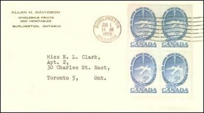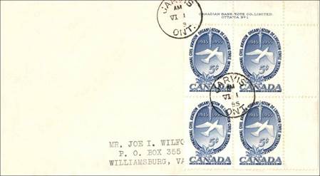 Middlesex Stamp Circle (Club) cachet; Coat of Arms; Map of Canada; Peace Tower in Ottawa; Brown and Green. Cancel at Simcoe, Ontario. Block of 4 stamps. (Type 1).