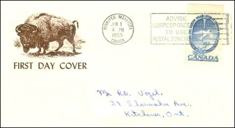 Jacoby type A cachet; Autographed by Designer: R.K. Smith. Cancel at Kitchener, Ontario. (See footnote 4)
