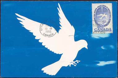 The designers of the Canadian stamp most likely also found their inspiration from the maximum card and the stamp issued for the Peace Conference held in Paris, France, from 29 July to 15 October 1946. The stamp (Prussian green, issued on 29 July 1946) shows woman’s hands releasing a dove that holds an olive branch in its beak. The same symbol of the peace dove with an olive branch had already been used on Scott #294 from France, 1F50 ultramarine, issued on 20 February 1934, designed by Daragnès. The symbolism of the dove with the olive branch was reproduced on the preliminary designs of the Canadian stamp. It is to be noted that the olive branch was not retained in the final draw of the stamp.