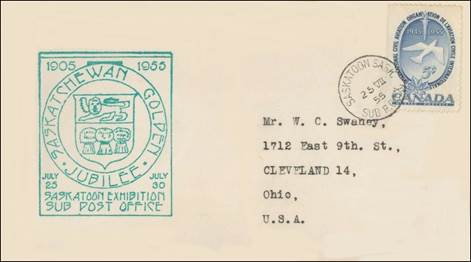 Saskatchewan joined the Canadian Confederation in 1905; 1955 was the Golden Jubilee Year. Cancel at Saskatoon. See Footnote 14.
