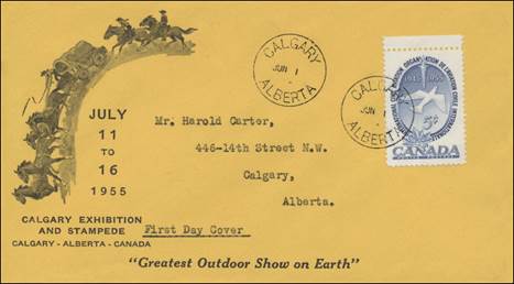 Cancel at the temporary post office of the Calgary (Alberta) Exhibition and Stampede. Alberta joined the Canadian Confederation in 1905; 1955 was the Golden Jubilee Year.