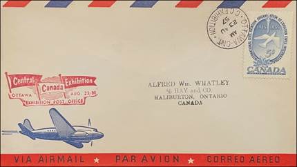 Mail using the ICAO stamp on an airmail cover prepared by the N.P.G. Ltd. Company (front). Cancel dated 23 August 1957. Central Canada Exhibition hand stamp, Ottawa, 23-31 July 1957.