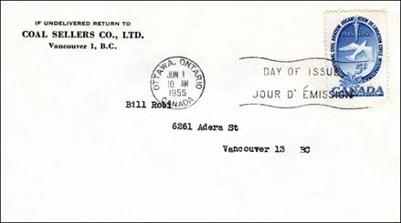 First day issue on service cover sent by Coal Sellers Co. (at Vancouver) cover. Cancel at Ottawa. |