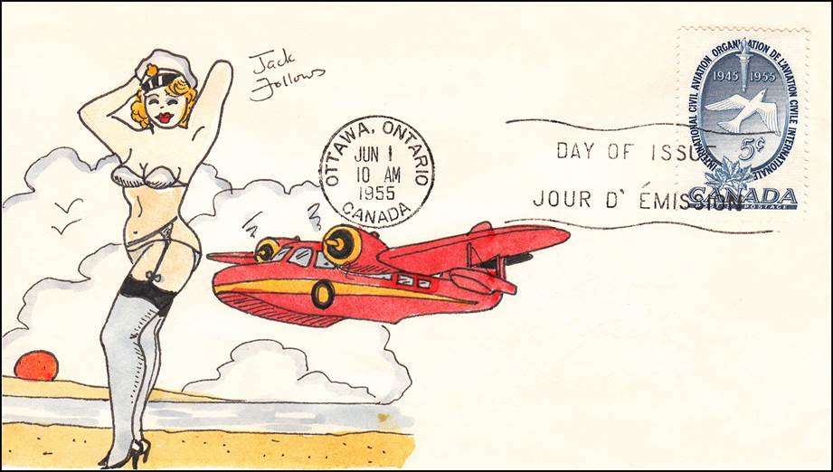 First Day Cover with cachet by Jack Follows. One-of-a-kind cover. On this totally awesome masterfully hand-drawn and lavishing hand-painted cachet, Jack Follows reminds us of the early days of air travel with his depiction of different vintage aircraft, single-wing and double-wing varieties, as they soar in the bountiful sky, which is punctuated with cotton-white clouds. The add-on cachets by Englishman, Jack Follows (1927-1997) are very popular with collectors. They do not appear in the marketplace very often. Follows was known for his cartoonlike cachets which combined the themes of women, aviation, and comic characters. Each cachet was unique in design.