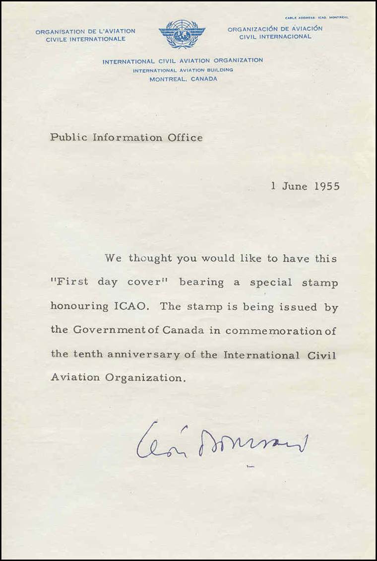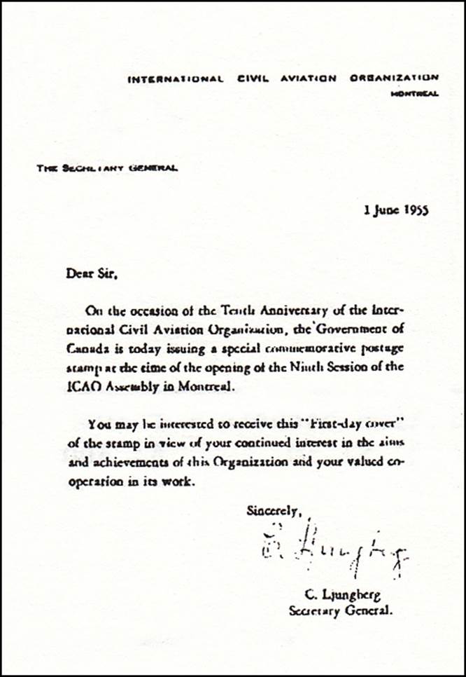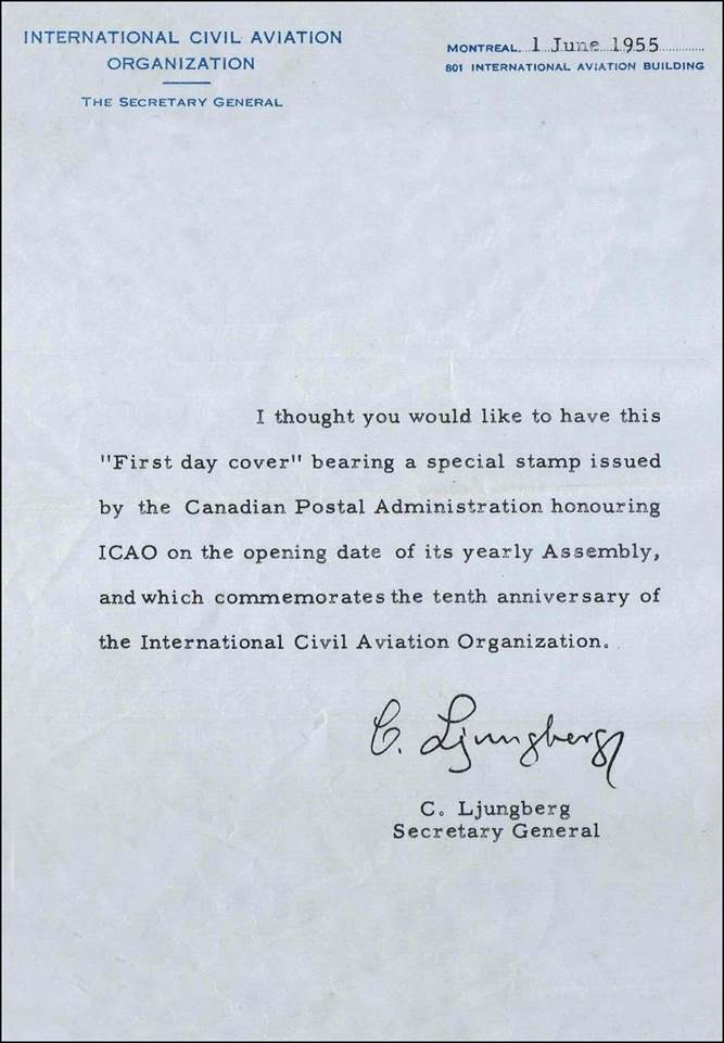 The then-ICAO Secretary General, Carl Ljungberg, individually signed the printed note sent along with this FDC. There were at least two official distribution lists, with different printed letters made for each.