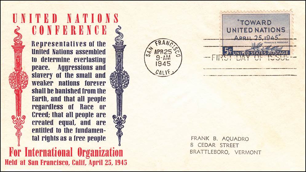 25 April 1945 - United Nations Conference. United States First Day Cover. First Day of Issue postal cover with stamp and San Francisco postmark. |
