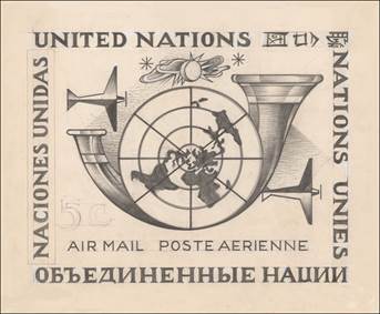 When the UN stamp programme for 1955 was established, it was found necessary once again to solicit the artists who had responded to the 1952 invitation. The issuance of stamps honouring the 10th anniversary of ICAO’s activities was suggested by the UNPA for February 1955, as their stamp programme already comprised two issues on fixed dates in the second part of that year, i.e. on UN day (24 October) and Human Rights Day (10 December, which is the anniversary day of the adoption by the UN General Assembly of the Universal Declaration of Human Rights in 1948).