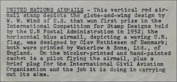 United Nations New-York First Day of Issue and its insert providing details. Airmail issue (two stamps) of 9 February 1959. Overseas Mailers cachet: Pilot flying his plane. Bicolor-printed and hand-painted cachet. The vertical rose-red airmail stamp depicts the globe-and-wing design by W.W. Wind of USA that won the first prize in the international competition for stamps designs held by the UN Postal Administration in 1952. |