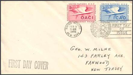 (1) Below is a copy of the notice found in the ICAO Bulletin, January/February 1955, showing the First Day Cover.