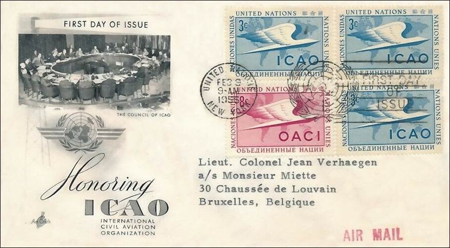 First Day Cover addressed to the Lieutenant Colonel Jean Verhaegen with signed card by Edward Pearson Warner, President of the ICAO Council.