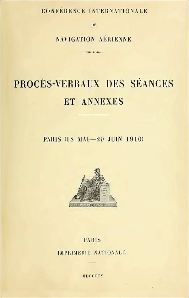 Commissions were held on the following four subjects: law of nations; administrative and technical; customs; regulation of the aerial navigation. A number of basic principles governing aviation were laid down through the Projet d’une convention internationale relative à la navigation aérienne. This draft international convention relating to the aerial navigation comprised 7 chapters and 55 articles and three annexes: marks of nationality and registration; characteristics of the aircraft; rules of the air traffic.