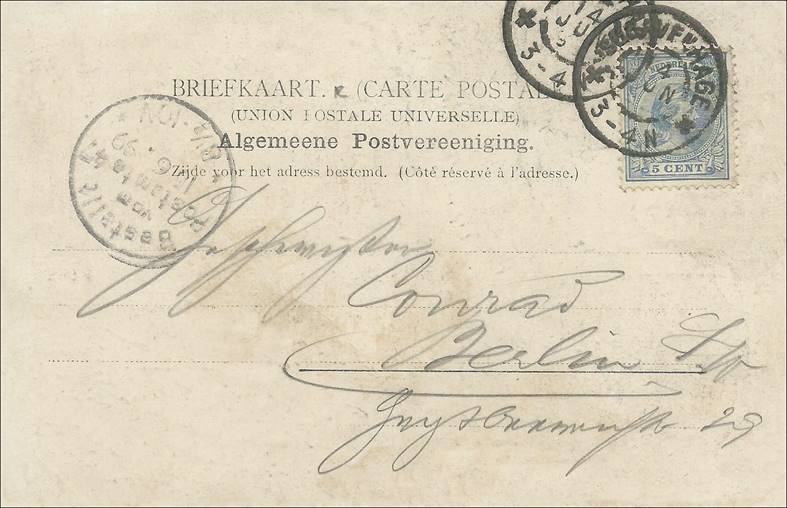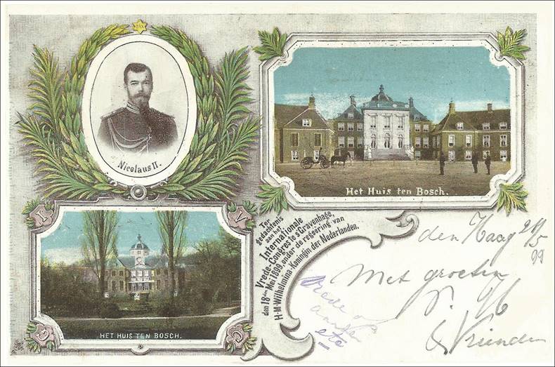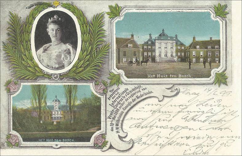International Peace Conference at The Hague in 1899 - Two postcards (front and back) showing Wilhelmina, Queen of the Netherlands (at the top), Nicholas II, Emperor of Russia (at the bottom), and the Huis ten Bosch. Photo Credit to UNPI Special Auction 73.