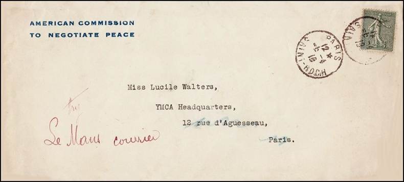 Service cover sent from the American Commission to Negotiate Peace after World War I. The postal cancel bears the name of Saint Roch, Paris. Cancel date: 12 / 4 / 19. From the collection of John M. Hotchner.