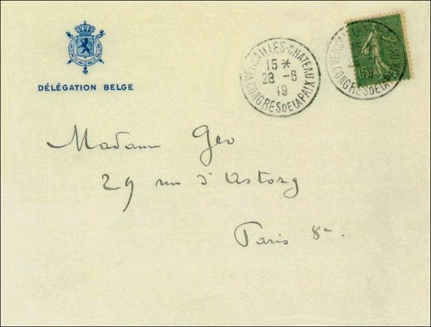 Belgium sent a substantial delegation to the Peace Conference at Versailles. This cover was mailed from the special post office in the Chateau de Versailles on 28 June 1919, the day that the Treaty was signed. Image from the file: "MAIL OF THE CONGRESS OF VERSAILLES 1919". |