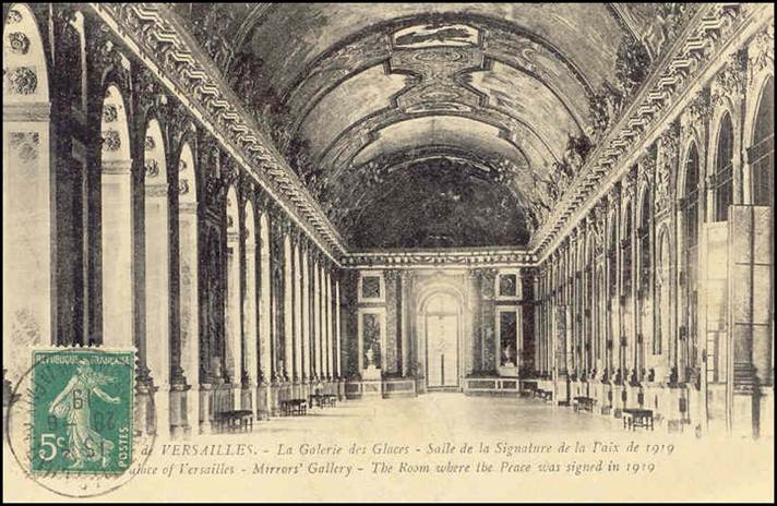 The postmark on the reverse side of this postcard is dated 28 June 1919 (VERSAILLES - CHATEAU CONGRES DE LA PAIX), date on which the Peace Treaty of Versailles was signed by Germany and the Allied powers at the Palace of Versailles. The Peace Congress and the resulting Treaty of Versailles, commemorated on the illustrated cover shown here, was the peace settlement signed after World War One had ended in 1918; the Congress brought together delegates from nearly thirty nations and imposed harsh terms on defeated Germany, Austria, Hungary and the Ottoman Empire. The Versailles Palace was considered the most appropriate venue simply because of its size - many hundreds of people were involved in the process and the final signing ceremony in the Hall of Mirrors could accommodate hundreds of dignitaries.