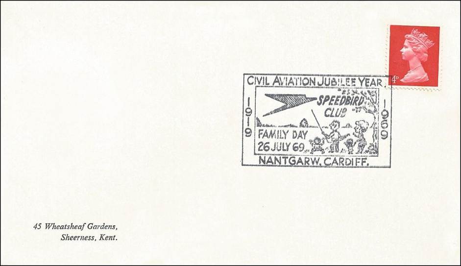 United Kingdom – 26 July 1969 – First Day Cover commemorating the 50th anniversary of Civil Aviation (1919-1969) and the Family Day at the Speedbird Club of Nantgarw, Cardiff.