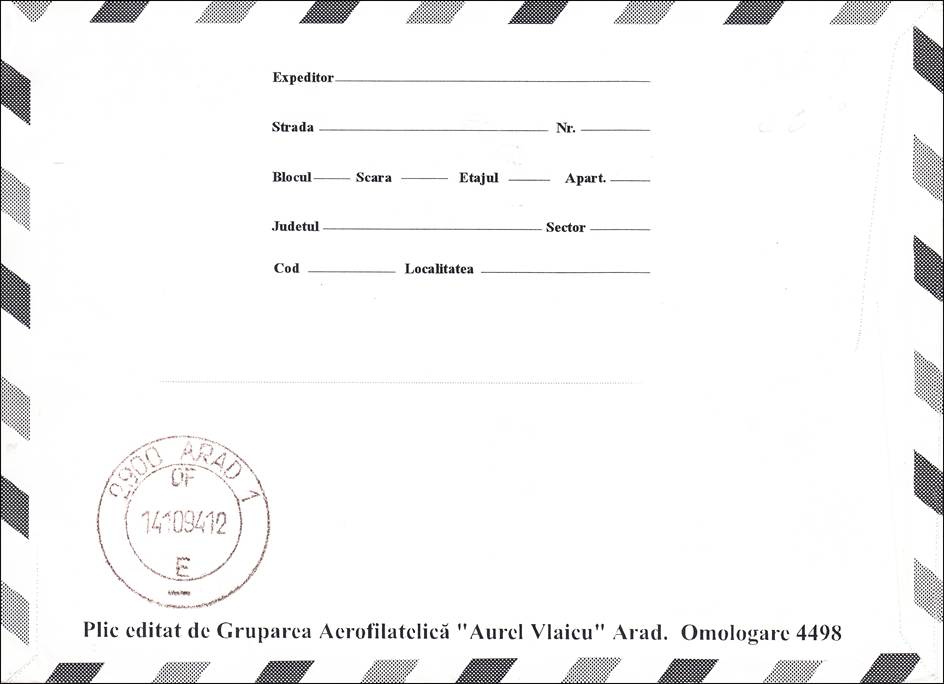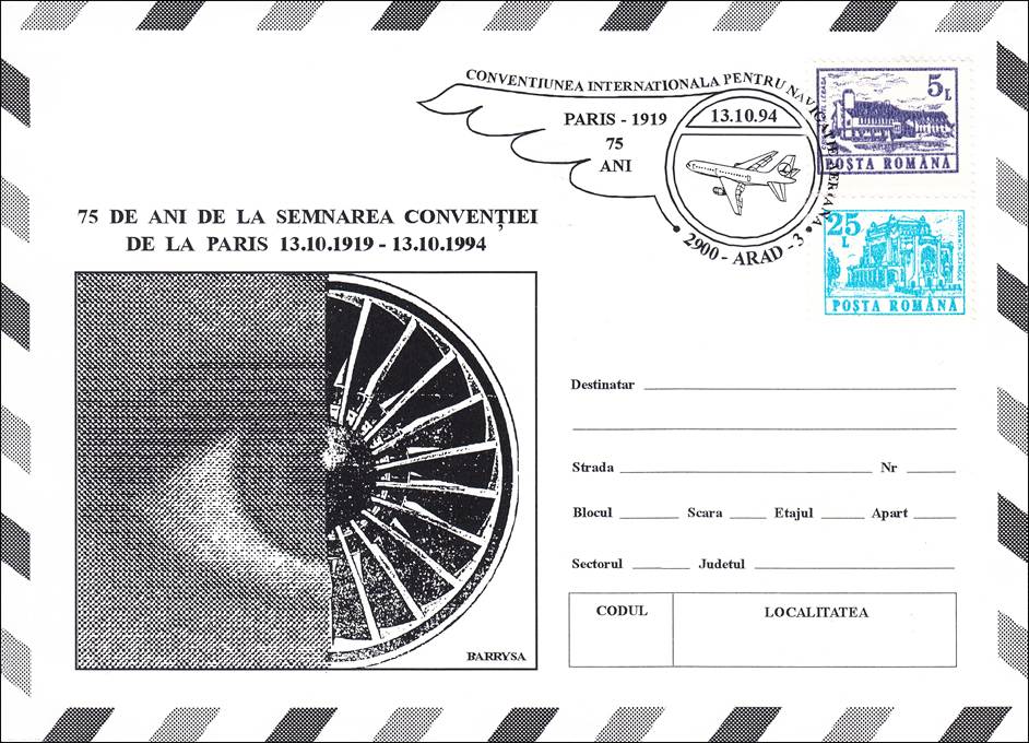 Romania – 13 October 1994 – Cover (recto and verso) commemorating the 75th Anniversary of the signing of the Convention Relating to the Regulation of Aerial Navigation (or Paris Convention). The text in the cachet 75 DE ANI DE LA SEMNAREA CONVENȚIEI DE LA PARIS 13.10.1919-13.10.1994 means 75 YEARS SINCE THE SIGNING OF THE PARIS CONVENTION 13.10.1919-13.10.1994, whereas the text of the cancel CONVENTIUNEA INTERNATIONALA PENTRU NAVIGATIE AERIANA means INTERNATIONAL CONVENTION FOR AIR NAVIGATION.