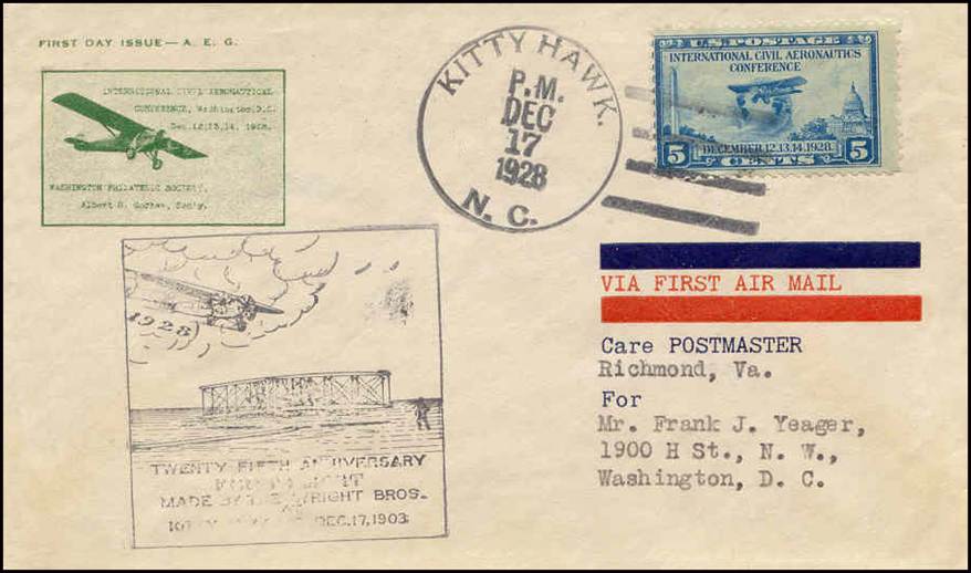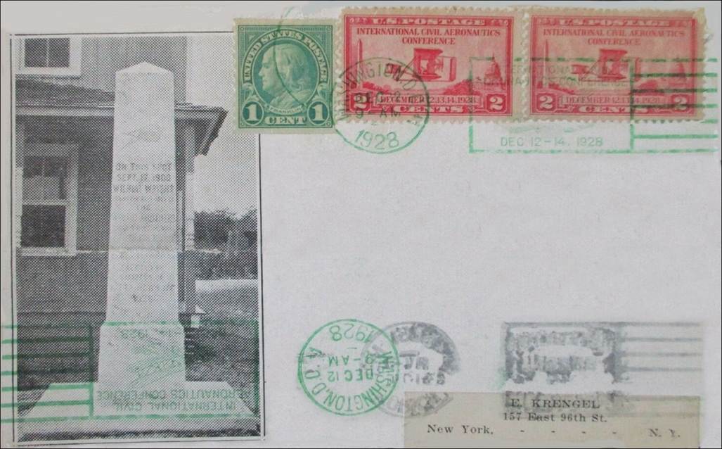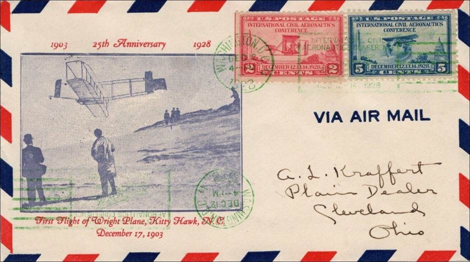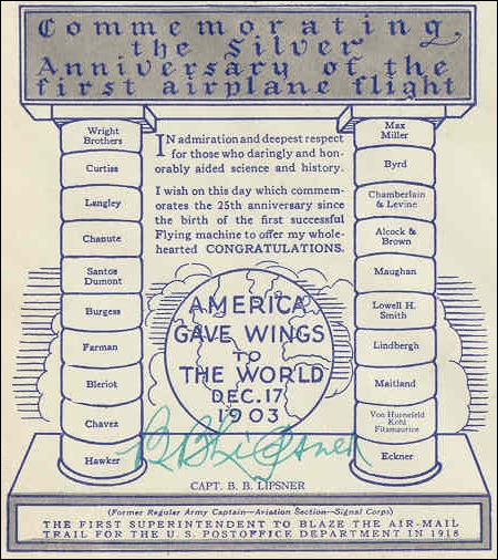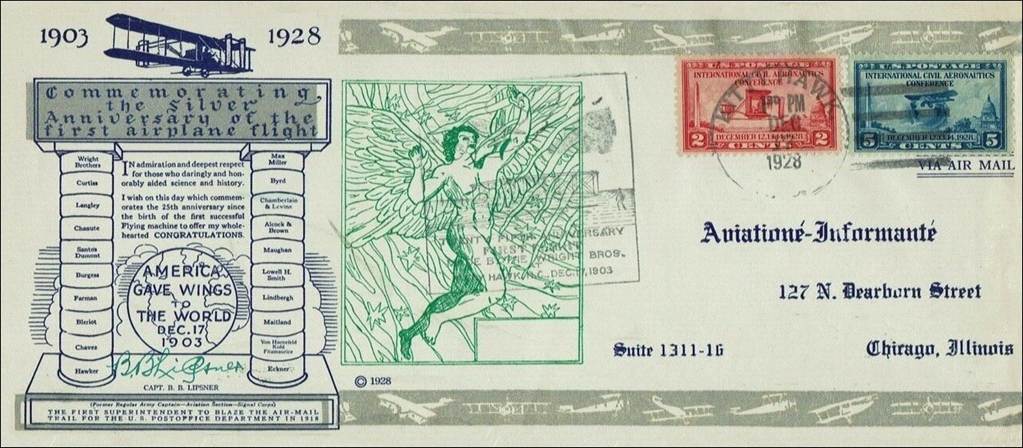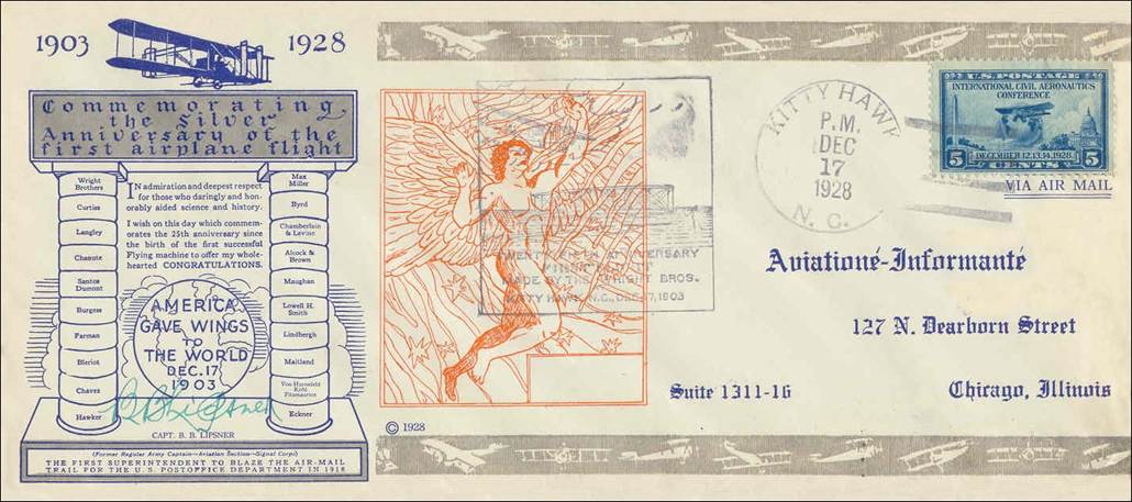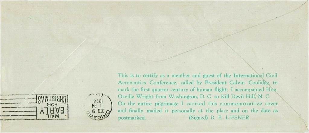 Commemorative covers (17 December 1928 cancel) personally signed by Capt. Benjamin B. Lipsner, America's first Air Mail Superintendent in 1918, members and guests of the International Civil Aeronautics Conference, who accompanied Orville Wright from Washington, D.C. to Kill Devil Hill, N.C. The printed cachet at left and rubberstamped cachet in the centre commemorate the 25th Silver Anniversary of the "First Flight by the Wright Brothers". The front is printed in three inks: blue for the leftmost cachet and address, silver for the shading in the cachet and strips at the top and bottom outlining airplanes, and green (or orange) for the allegory of flight. The cachet at left bears a tribute to the Wright Brothers by Captain B.B. Lipsner. There is also a black hand stamp at the front centre that reads: “Twenty-Fifth Anniversary First Flight made by the Wright Bros. at Kitty Hawk, N.C., Dec. 17, 1903”. Beyond the attractiveness of this cover below, is the content of the cachet: two columns made up of the names of flight and airplane pioneers. Over half of them have been honoured on stamps issued by the United States or other nations for their contributions to the development of aeronautics. On the back is a green hand stamp that reads: “This is to certify as a member and guest of the International Civil Aeronautics Conference, called by President Calvin Coolidge, to mark the first quarter-century of human flight, I accompanied Hon. Orville Wright from Washington, D.C., to Kill Devil Hill, N.C. On the entire pilgrimage, I carried this cover and finally mailed it personally at the place and on the date as postmarked. (Signed) B.B. Lispner.”