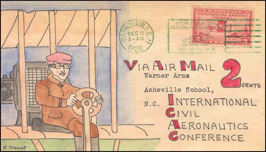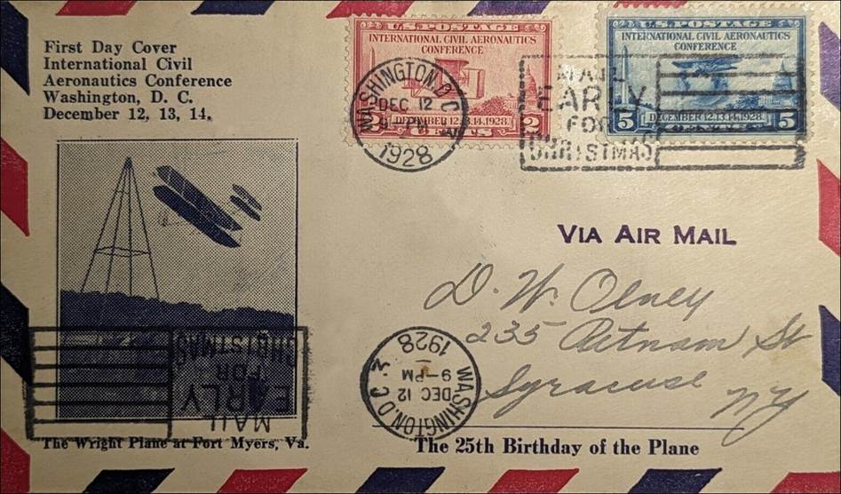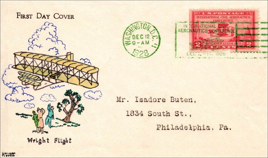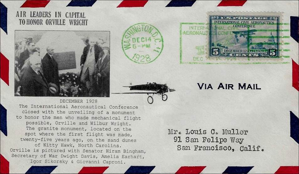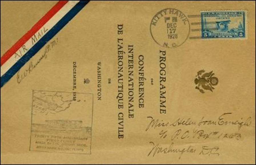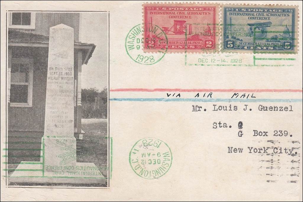 Commemorative covers (17 December 1928 cancel) personally signed by Capt. Benjamin B. Lipsner, America's first Air Mail Superintendent in 1918, members and guests of the International Civil Aeronautics Conference, who accompanied Orville Wright from Washington, D.C. to Kill Devil Hill, N.C. The printed cachet at left and rubberstamped cachet in the centre commemorate the 25th Silver Anniversary of the "First Flight by the Wright Brothers". The front is printed in three inks: blue for the leftmost cachet and address, silver for the shading in the cachet and strips at the top and bottom outlining airplanes, and green (or orange) for the allegory of flight. The cachet at left bears a tribute to the Wright Brothers by Captain B.B. Lipsner. There is also a black hand stamp at the front centre that reads: “Twenty-Fifth Anniversary First Flight made by the Wright Bros. at Kitty Hawk, N.C., Dec. 17, 1903”. Beyond the attractiveness of this cover below, is the content of the cachet: two columns made up of the names of flight and airplane pioneers. Over half of them have been honoured on stamps issued by the United States or other nations for their contributions to the development of aeronautics. On the back is a green hand stamp that reads: “This is to certify as a member and guest of the International Civil Aeronautics Conference, called by President Calvin Coolidge, to mark the first quarter-century of human flight, I accompanied Hon. Orville Wright from Washington, D.C., to Kill Devil Hill, N.C. On the entire pilgrimage, I carried this cover and finally mailed it personally at the place and on the date as postmarked. (Signed) B.B. Lispner.”