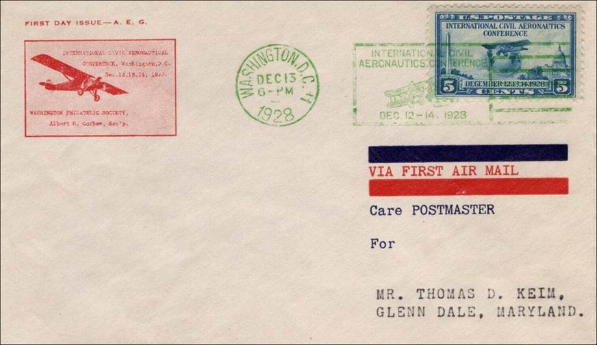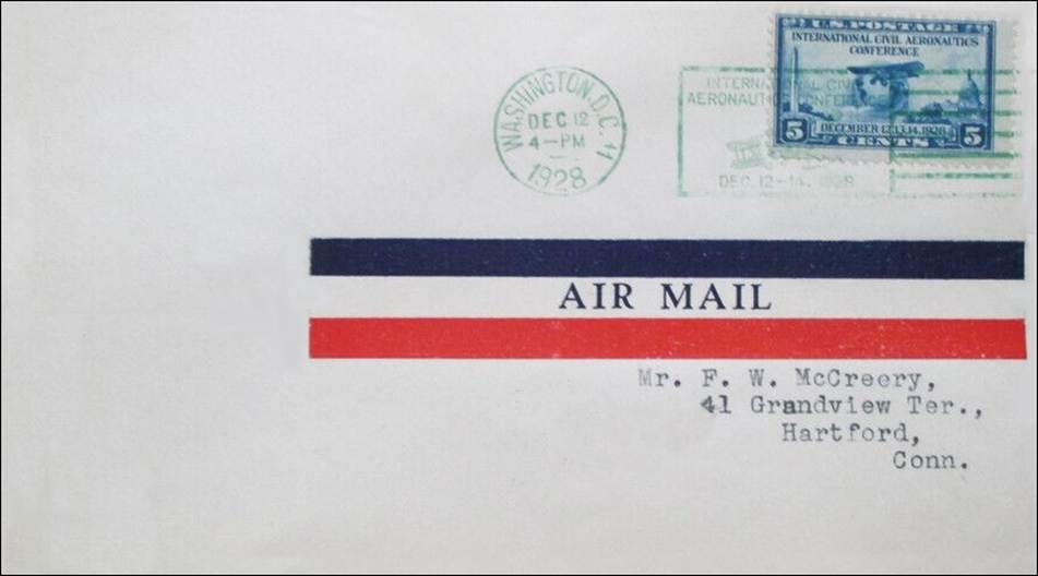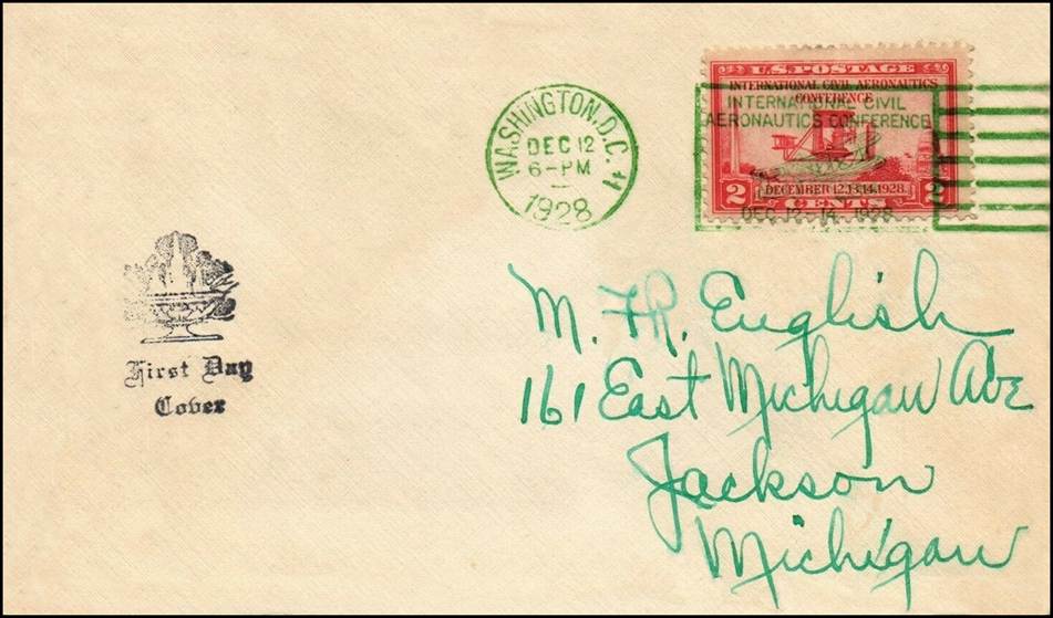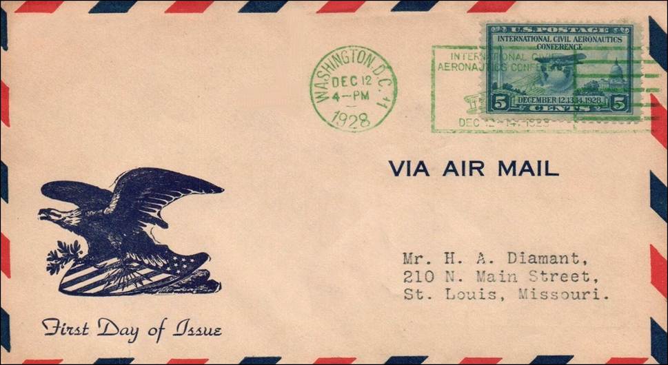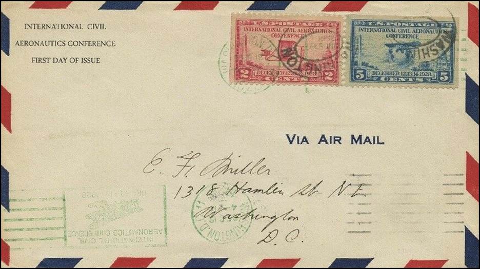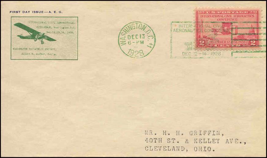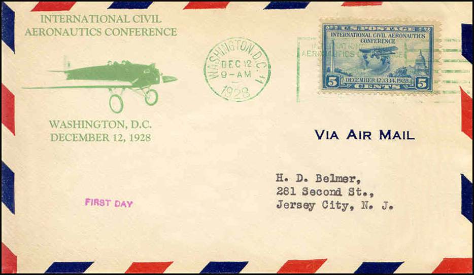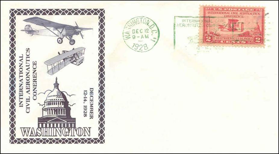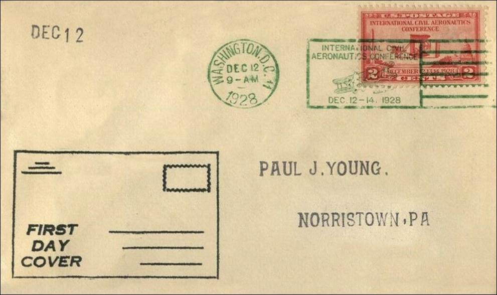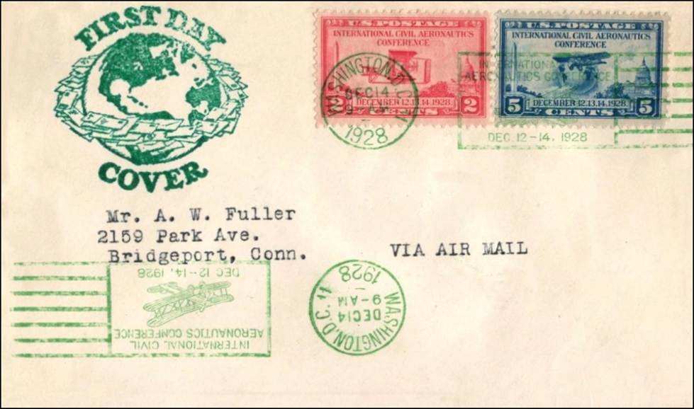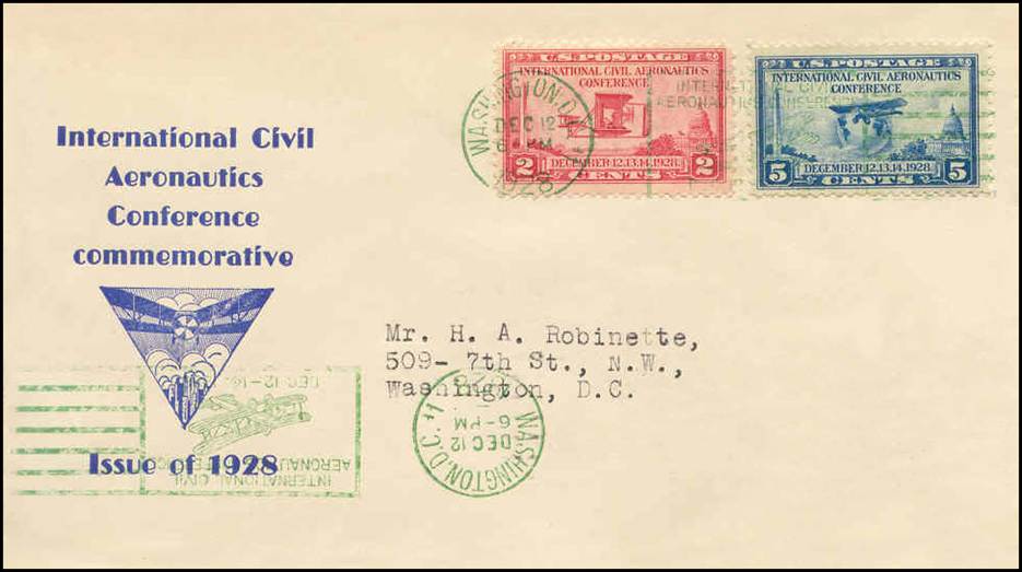 The First Day Covers bear the conference first-day logo in green and a Washington, D.C., DEC. 12, 1928 circular date stamp. However, postmark dates range from 12 to 14 December 1928. More information on the stamp issue can be found by clicking on: USA - 1928 - International Conference on Civil Aeronautics.