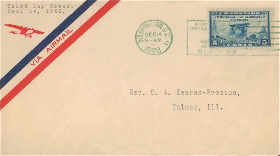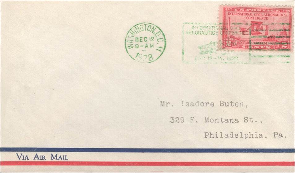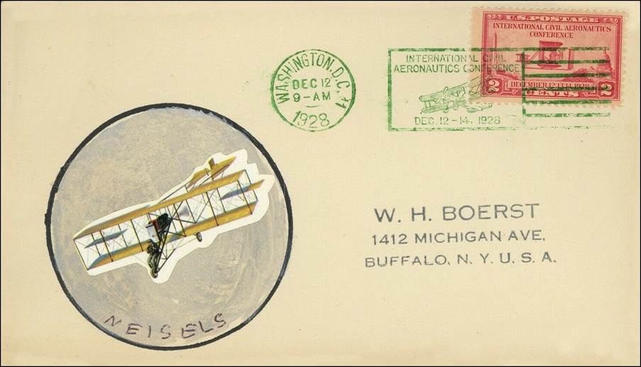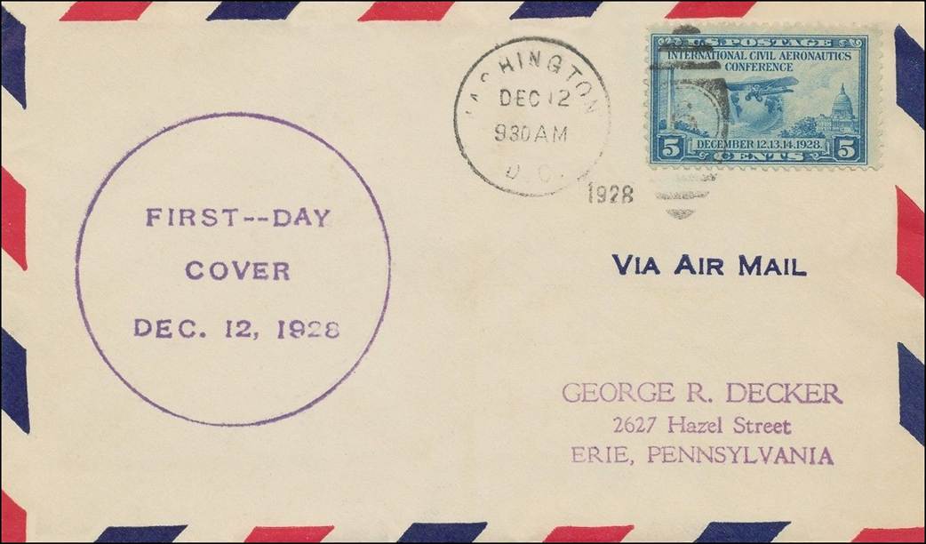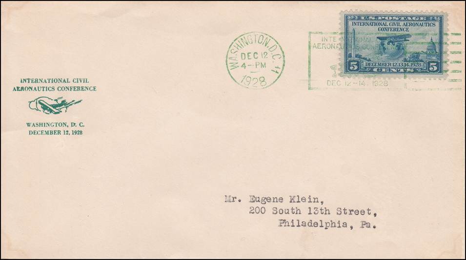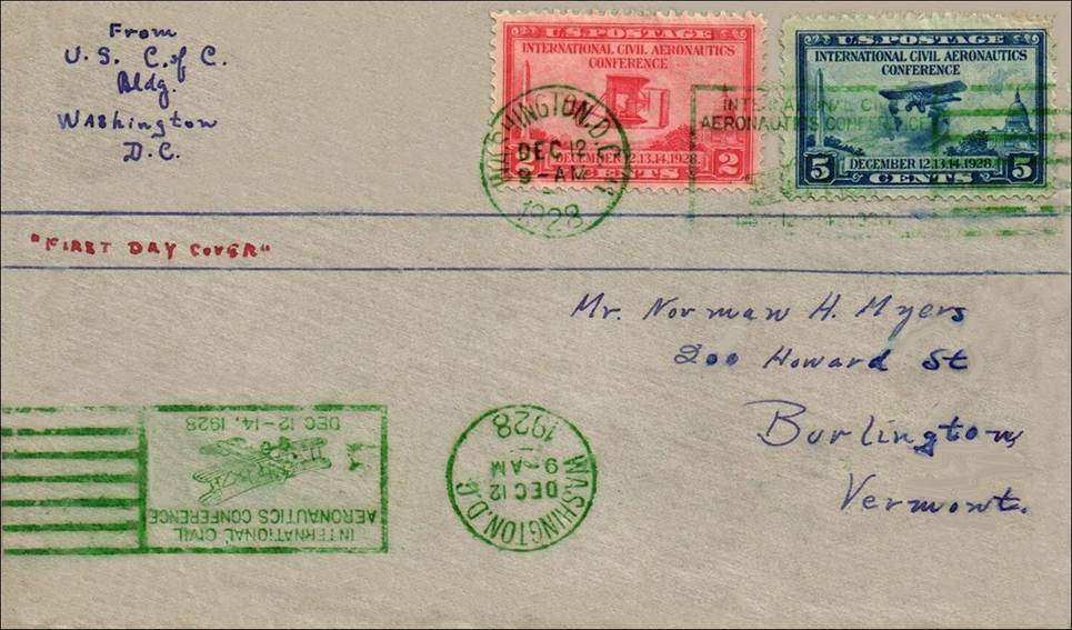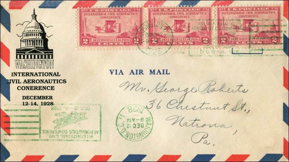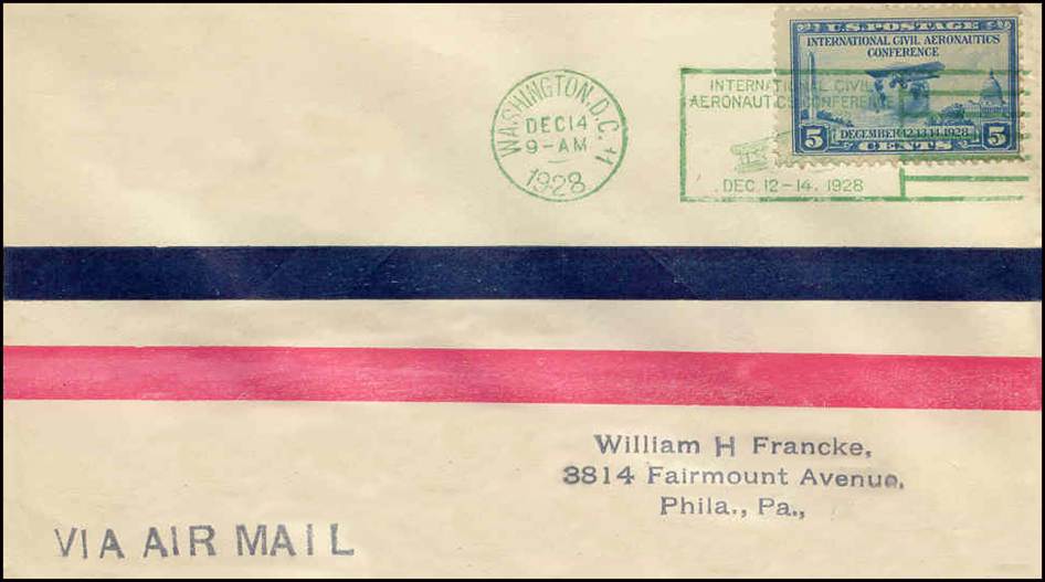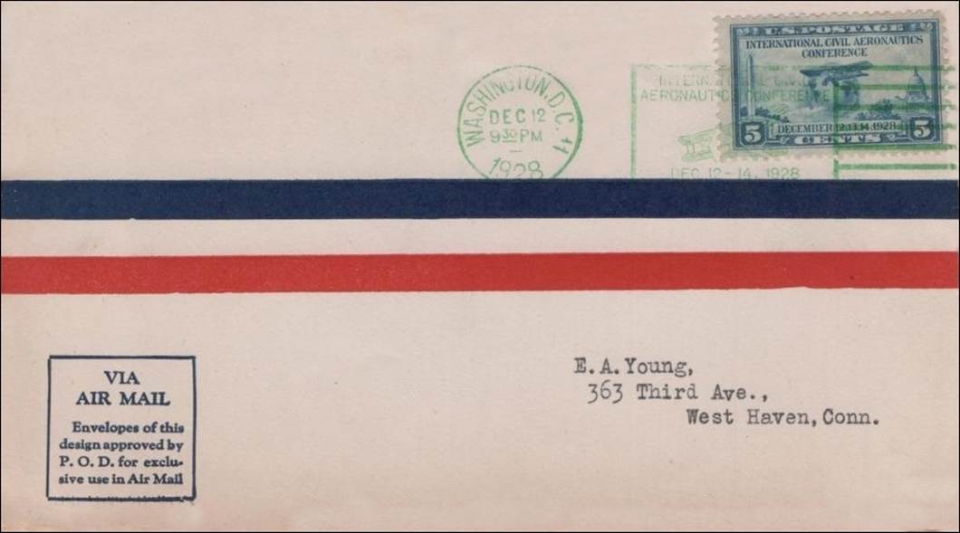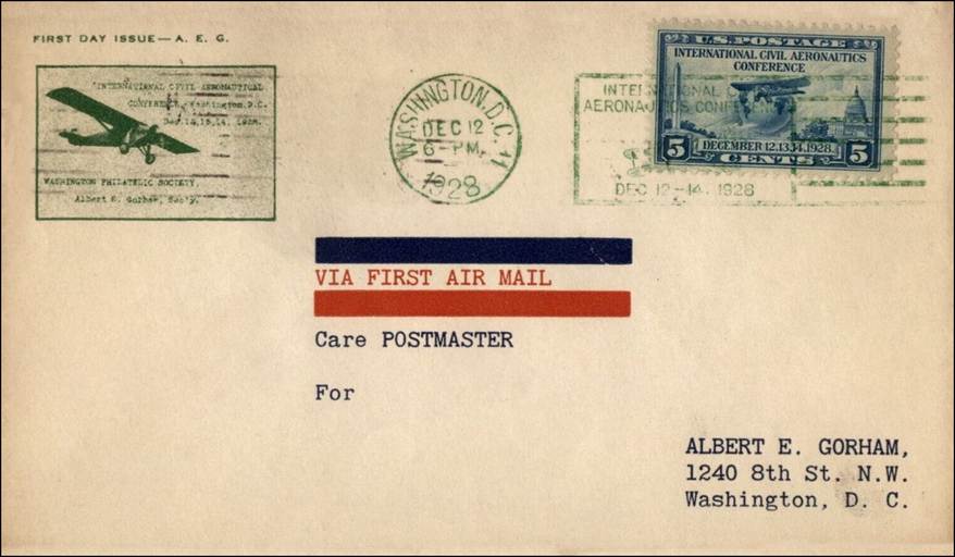 The First Day Covers bear the conference first-day logo in green and a Washington, D.C., DEC. 12, 1928 circular date stamp. However, postmark dates range from 12 to 14 December 1928. More information on the stamp issue can be found by clicking on: USA - 1928 - International Conference on Civil Aeronautics.