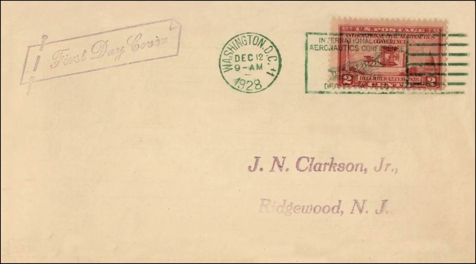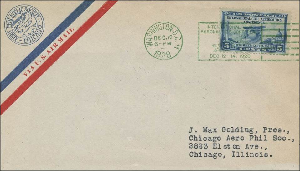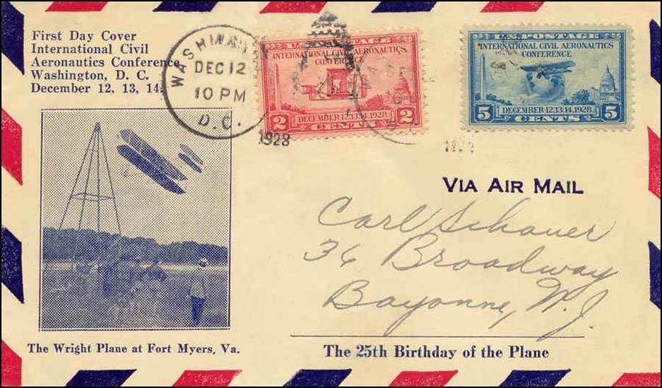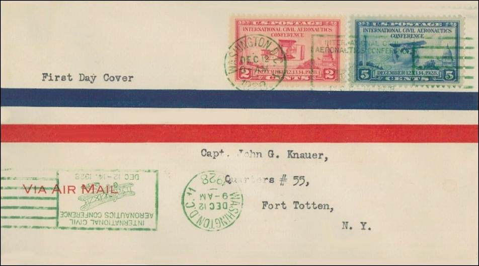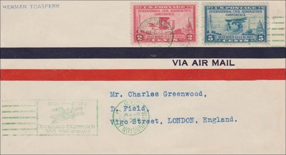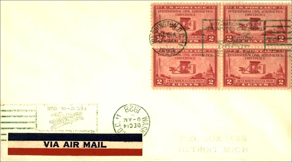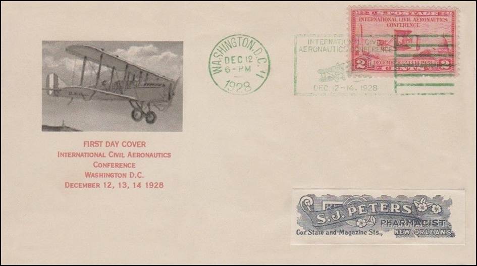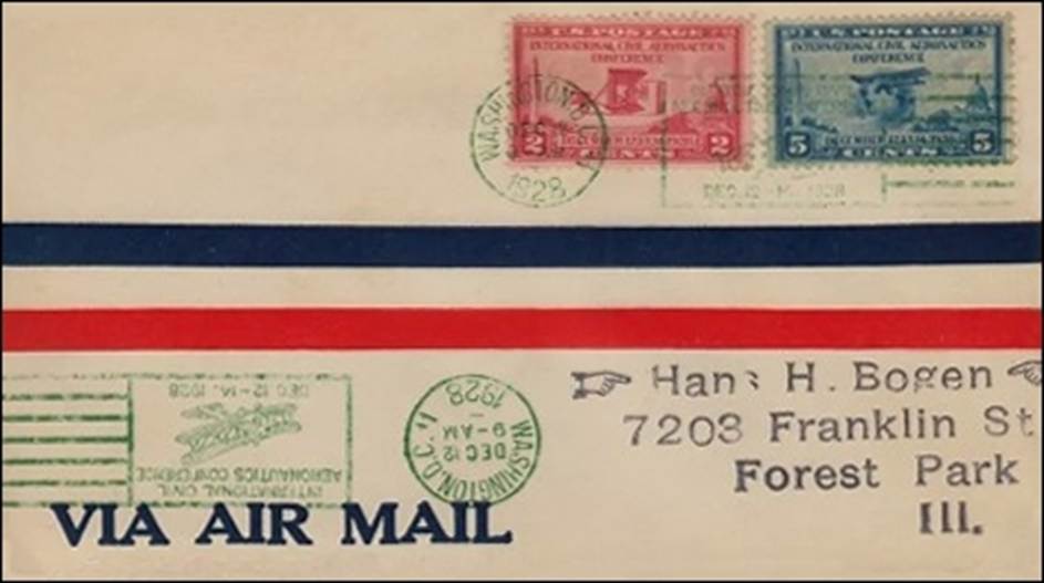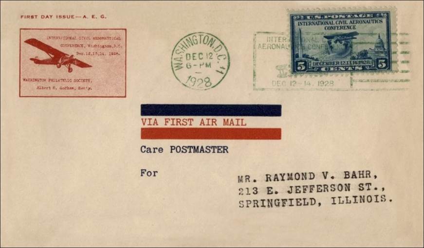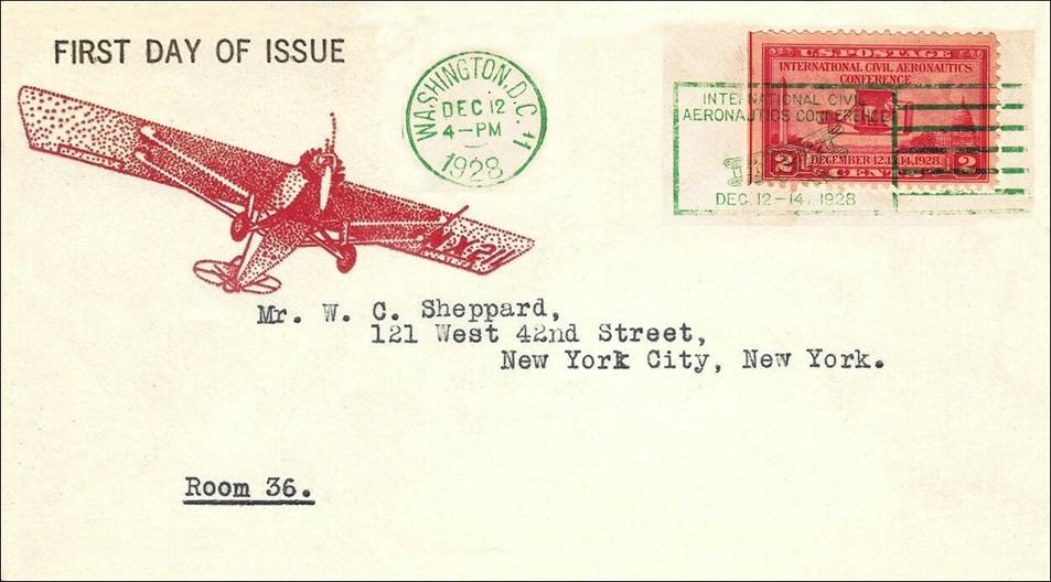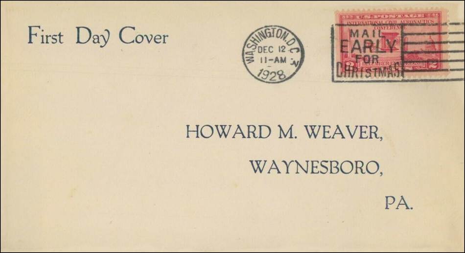 The First Day Covers bear the conference first-day logo in green and a Washington, D.C., DEC. 12, 1928 circular date stamp. However, postmark dates range from 12 to 14 December 1928. More information on the stamp issue can be found by clicking on: USA - 1928 - International Conference on Civil Aeronautics.