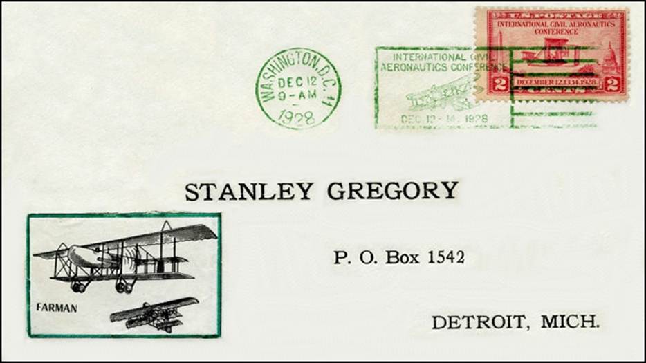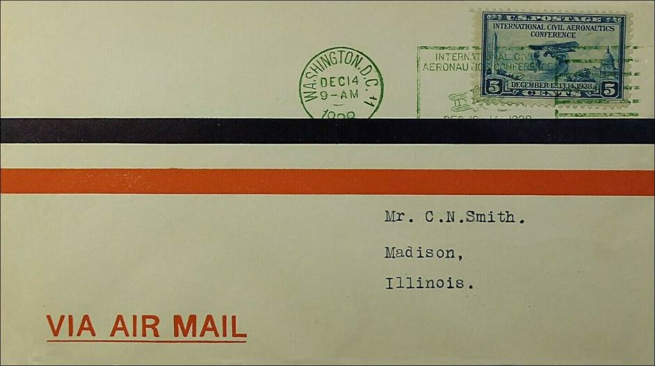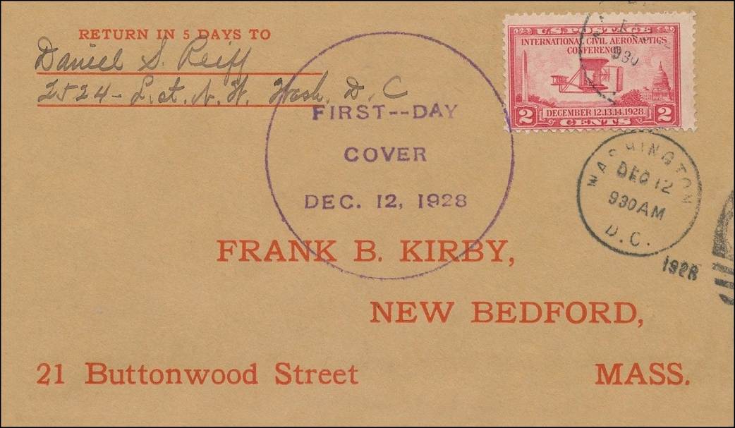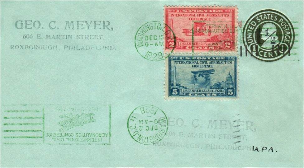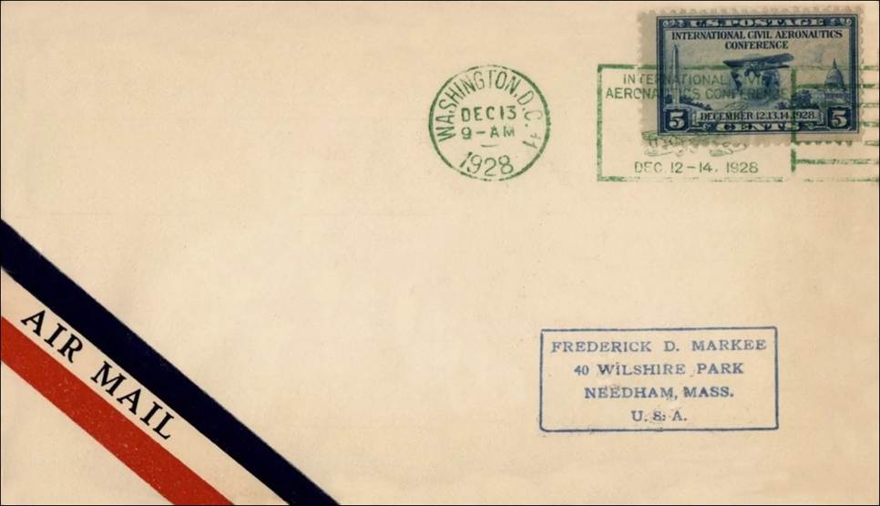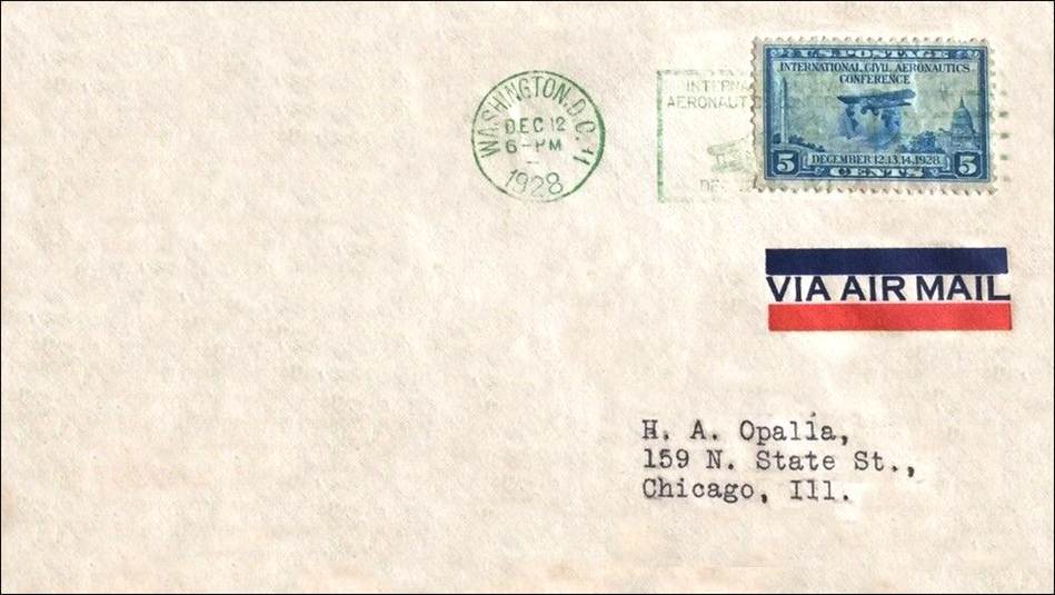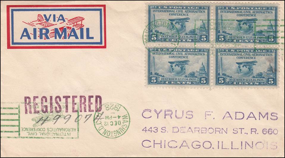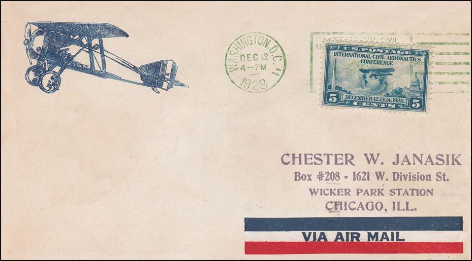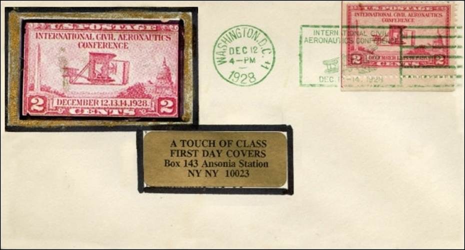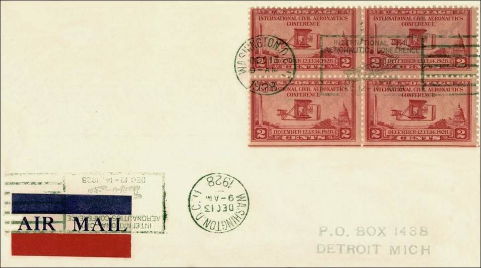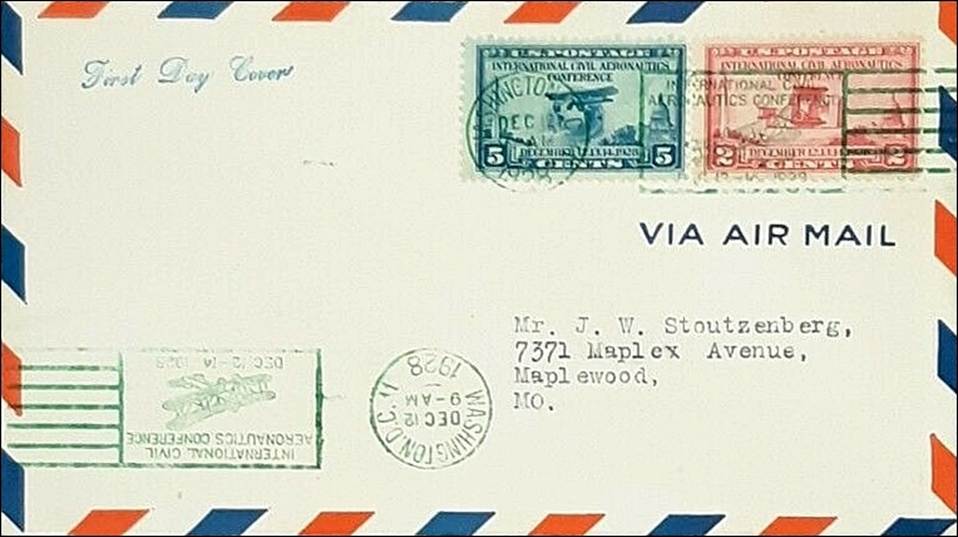 The First Day Covers bear the conference first-day logo in green and a Washington, D.C., DEC. 12, 1928 circular date stamp. However, postmark dates range from 12 to 14 December 1928. More information on the stamp issue can be found by clicking on: USA - 1928 - International Conference on Civil Aeronautics.