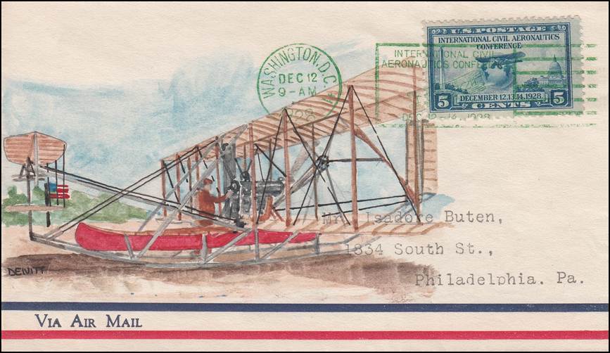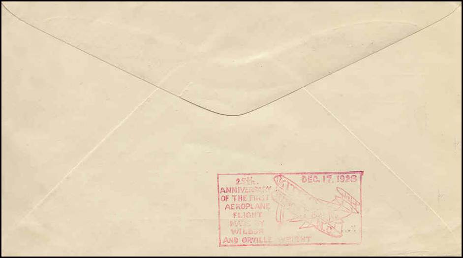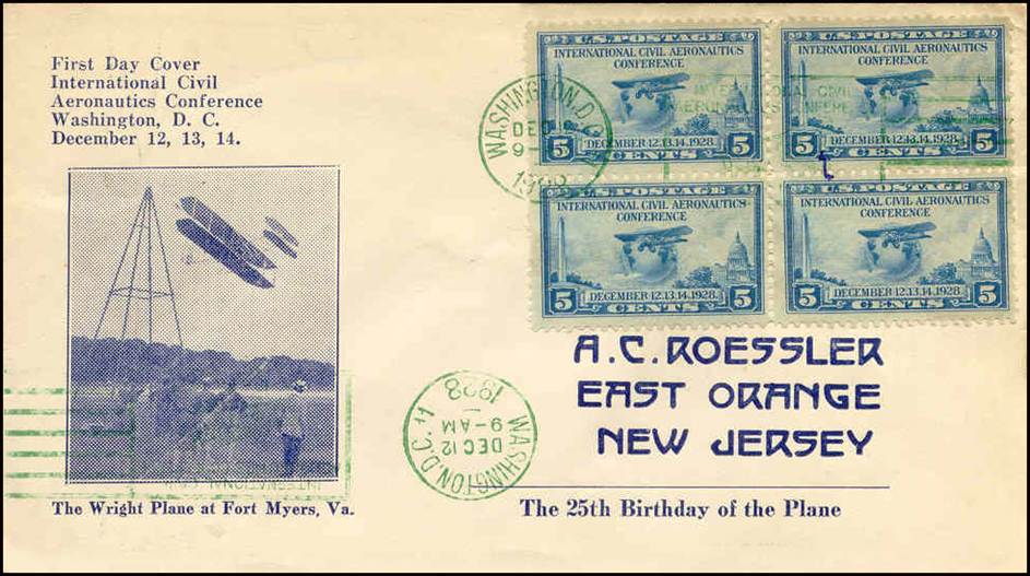 First Day Cover (front and back): A.C. Roessler (New Jersey stamp dealer-publisher-cachet maker) cachet depicting the Wright Brothers plane at Fort Myers, VA, USA