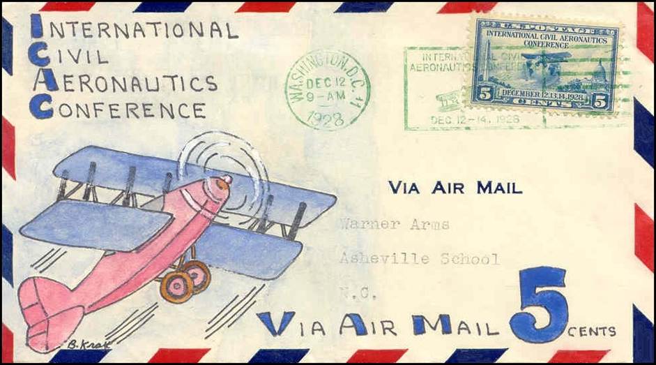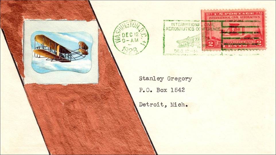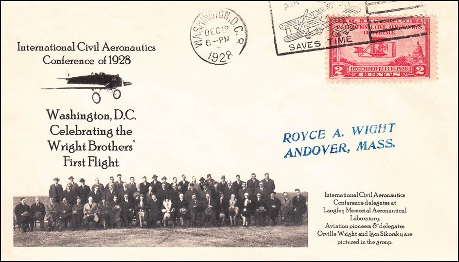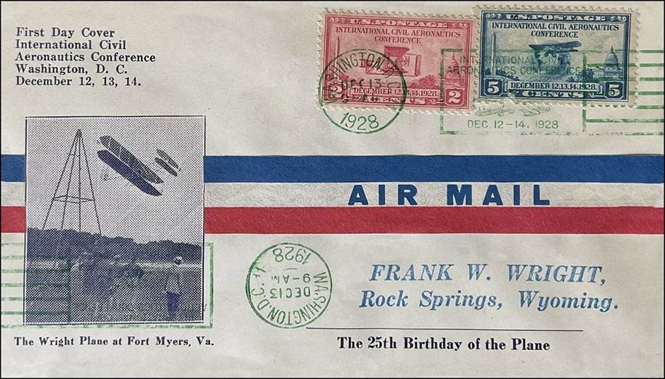 International Civil Aeronautics Conference of Washington programs in English and French with the 2 stamps issued for the Conference, both addressed to Washington, DC, signed by Kitty Hawk postmaster Elijah W. Baum, cacheted for the 25th anniversary of the Wright Brothers’ flight. Siderographer’s initials in the lower-left margin of the 2-cent block: C.V. De B. (Clyde Volchester De Binder).