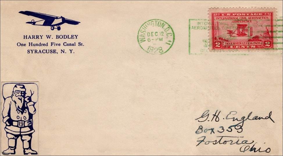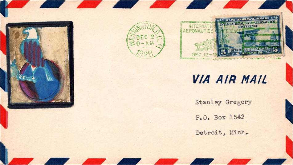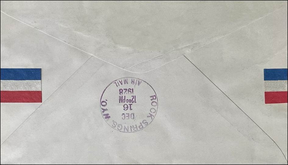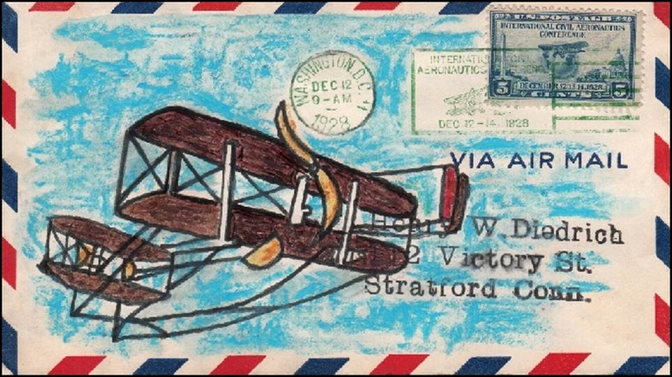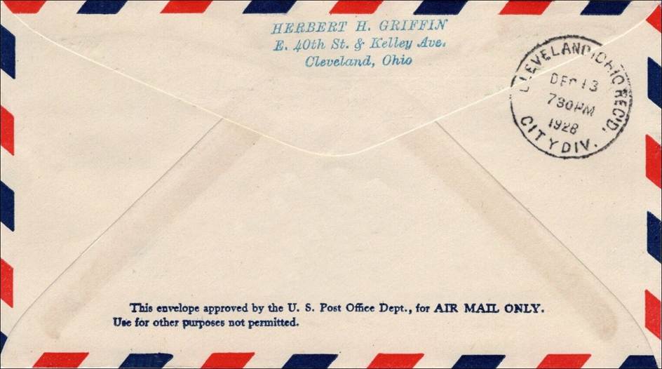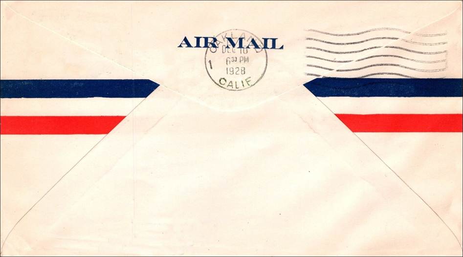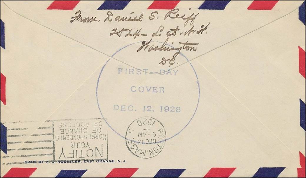 Front and back covers with CDS (Circular Date Stamp) special cancel on 12 December 1928.The airmail cover was produced by Albert Charles Roessler, who was both a stamp and coin collector and dealer.