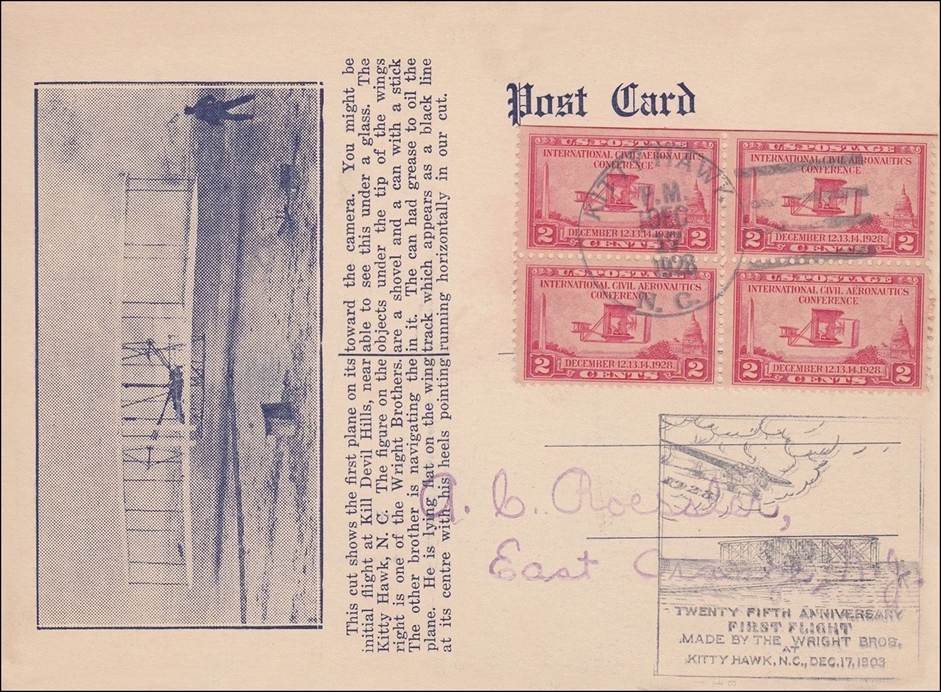 Historic postal cover with 1928 5c stamp postmarked Kitty Hawk, North Carolina, Dec 17 1928, with special rubberstamped pictorial cachet commemorating the 25th anniversary of the Wright brothers' first flight.