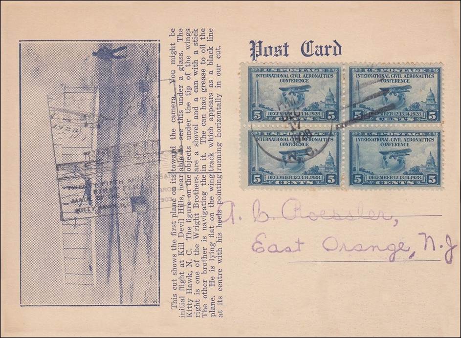 USA 1928 Two Roessler cacheted first day cards with blocks of four stamps of the International Civil Aeronautics Conference issue. Kitty Hawk North Carolina to East Orange Newark. 25th Anniversary of Wright Brothers first flight.