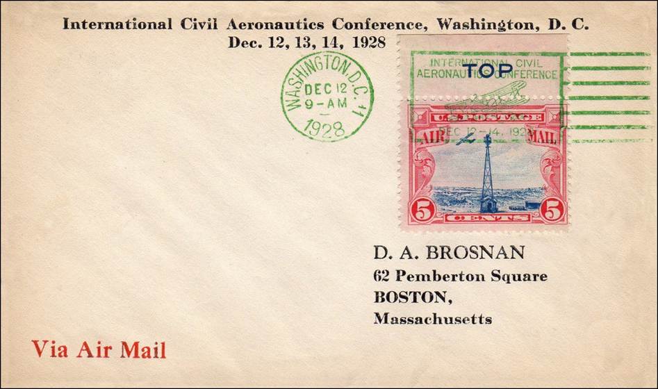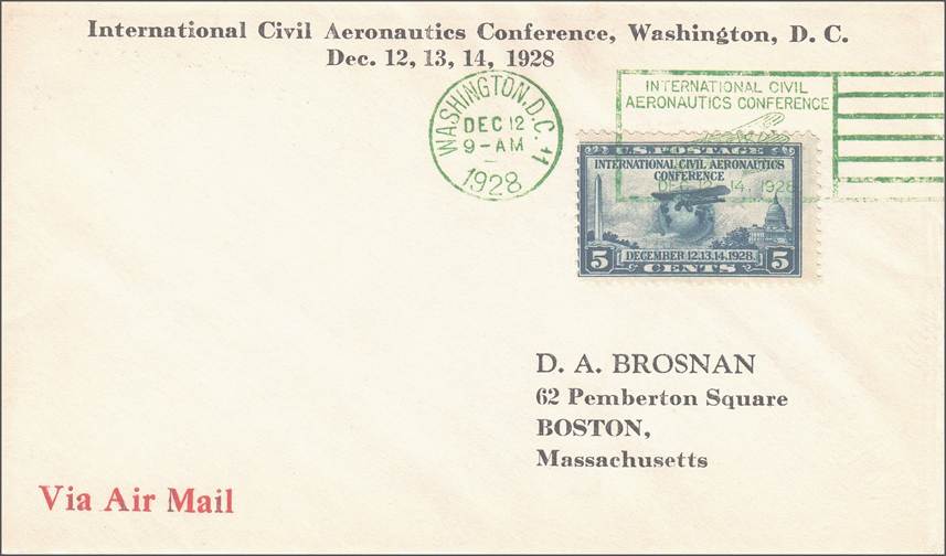 Official First Day Covers: Dominic A. Brosnan cachet. Dominic A. Brosnan, owner of Old Stamp Exchange at 62 Pemberton Square, Boston, MA, manufactured FDC Cachets from 1928 to 1930. The first Brosnan Cachet was based on the issue for the International Civil Aeronautics Conference.