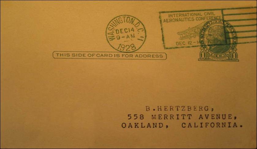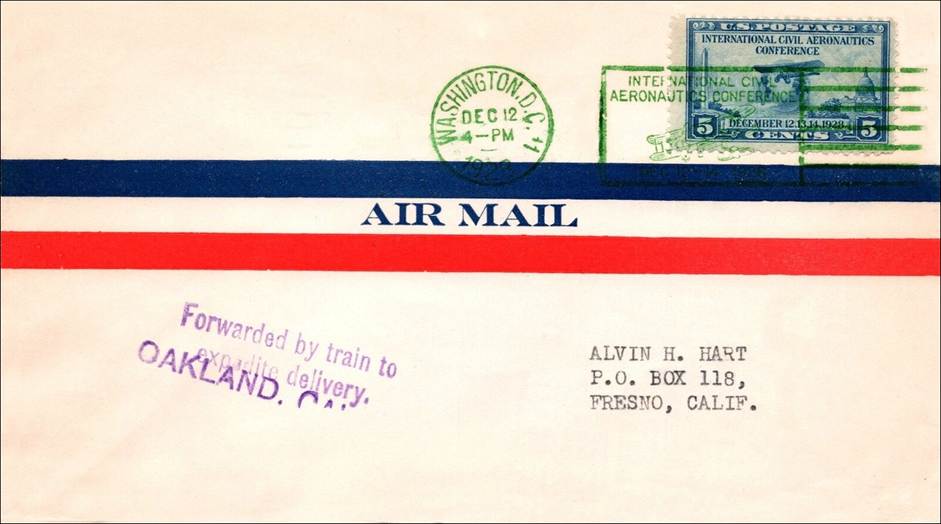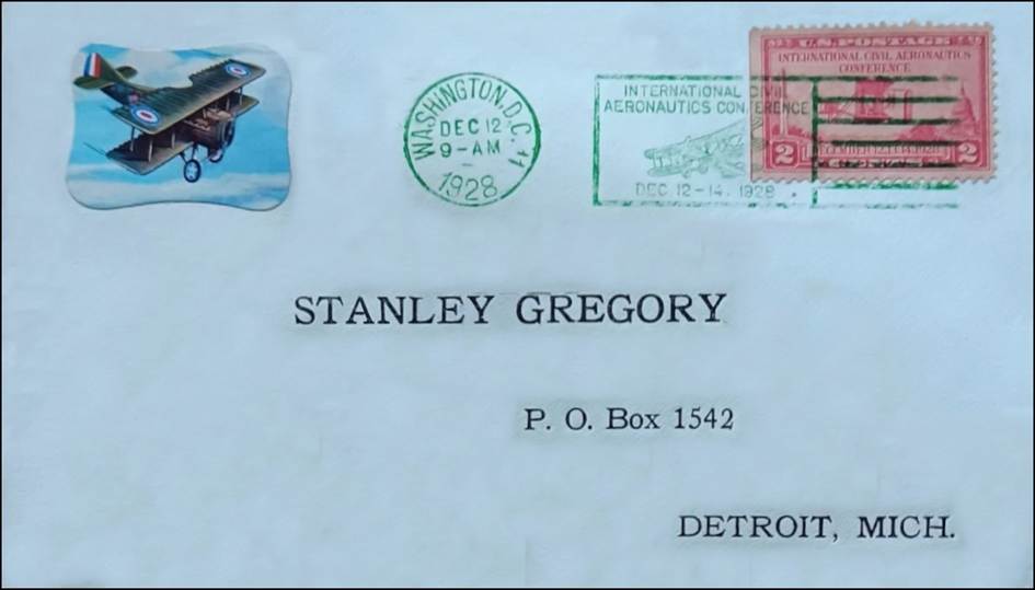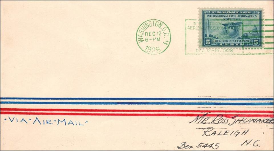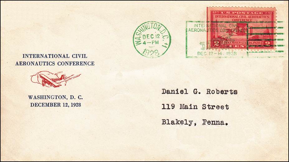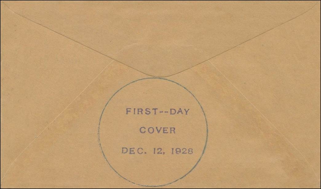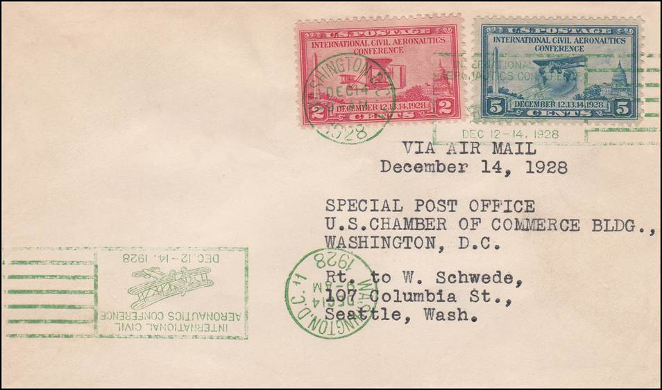 Cover sent from the Special Post Office opened in the U.S. Chamber of Commerce Building. Postmark dated 14 December 1928 (last day of issue). In those days, the establishment of a temporary post office station at a non-postal facility was unusual, thus reflecting the level of interest provided to this event by senior management.