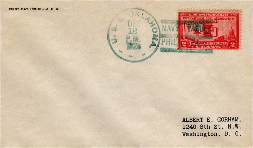 A. E. G., Albert E. Gorham Cover Cancel on the U.S.S. Oklahama. The U.S.S. Oklahama was built by the New York Shipbuilding Corporation for the United States Navy, notable for being the first American class of oil-burning dreadnoughts. Commissioned in 1916, the ship served in World War I as a part of Battleship Division Six, protecting Allied convoys on their way across the Atlantic. After the war, she served in both the United States Battle Fleet and Scouting Fleet. Oklahoma was modernized between 1927 and 1929. In 1936, she rescued American citizens and refugees from the Spanish Civil War. On returning to the West Coast in August of the same year, Oklahoma spent the rest of her service in the Pacific. On 7 December 1941, during the Japanese attack on Pearl Harbor, several torpedoes from torpedo bombers hit the Oklahoma's hull and the ship capsized. A total of 429 crew died.