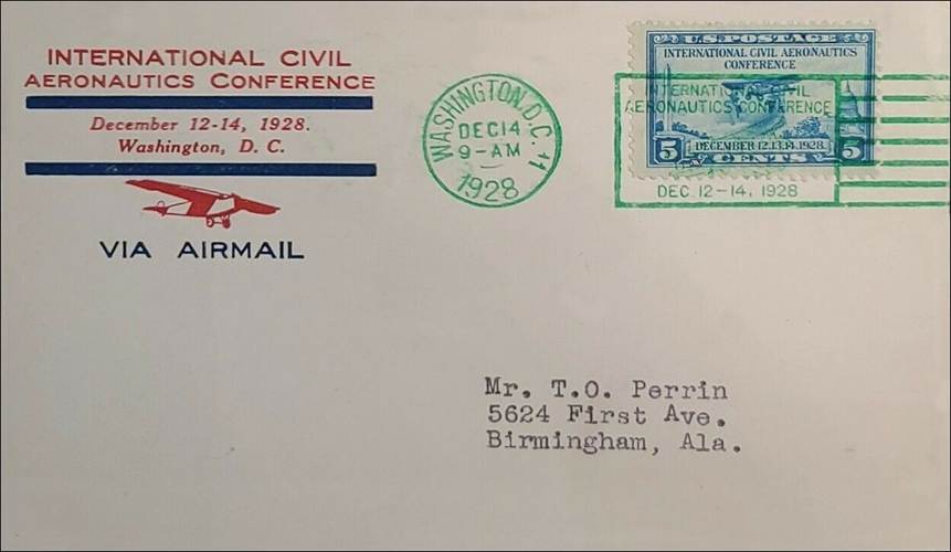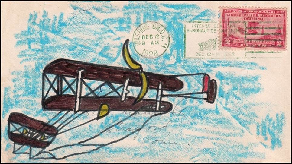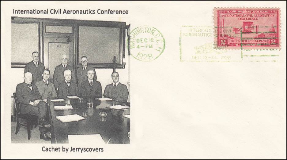 First Day Cover commemorating the International Civil Aeronautics Conference. Cachet is a one-of-a-kind add-on by Jerry's Covers and shows the US Delegation to the International Civil Aeronautics Conference; see the original picture below the first day cover. Sitting left to right: Nelson T. Johnson, Assistant Secretary of State; Edward P. Warner, Assistant Secretary of the Navy; Wm. F. Whiting, Secretary of Commerce; P. MacCracken, Assistant Secretary of Commerce; Harry F. Guggenheim, president of Guggenheim Fund for promotion of aeronautics. Standing left to right: Lester D. Gardner, president Aeronautical Chamber of Commerce; Joseph S. Ames, Chairman, National Advisory Committee for Aeronautics; and W.I. Glover, Assistant Postmaster General.
