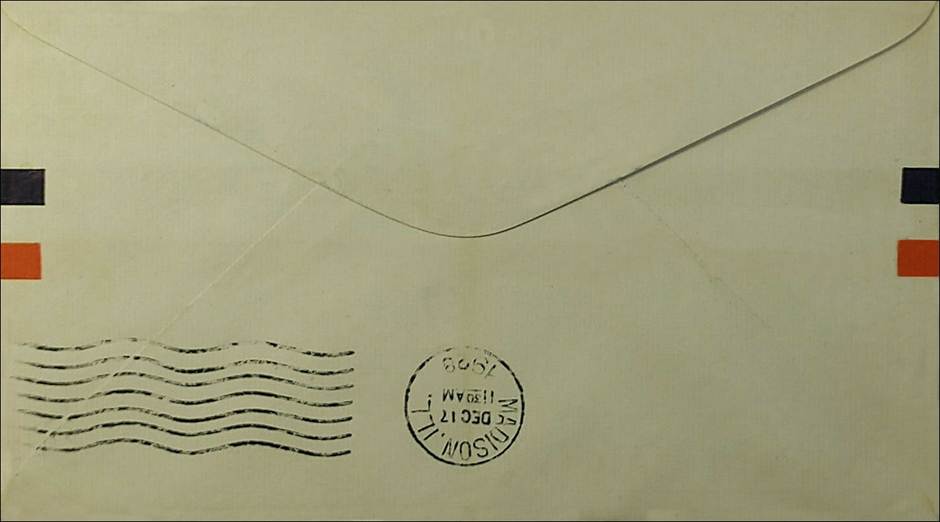 Last Day Air Mail Cover franked with 5-cent blue stamp (front and back). Black and red strips.