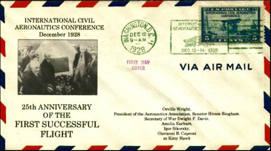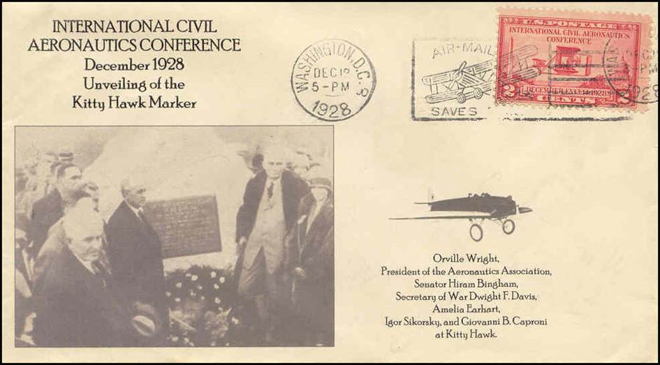 First Day Covers - On the left side: Picture showing Orville Wright, President of the Aeronautics Association, Senator Hiram Bingham, Secretary of War Dwight F. Davis, Amelia Earhart, Igor Sikorsky, Giovanni Battista Caproni (Italian aircraft manufacturer) at Kitty Hawk on 17 December 1928. |