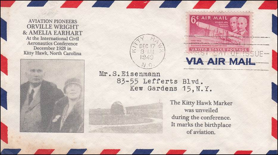 First Day Cover with cancel dated 17 December 1949, commemorating the 50th anniversary of the Wright’s feat. Picture showing Orville Wright, President of the Aeronautics Association, and Amelia Earhart. The second picture shows the Kitty Hawk Marker from where Orville Wright took off on 17 December 1903 in a machine designed and built by Wilbur and Orville Wright.