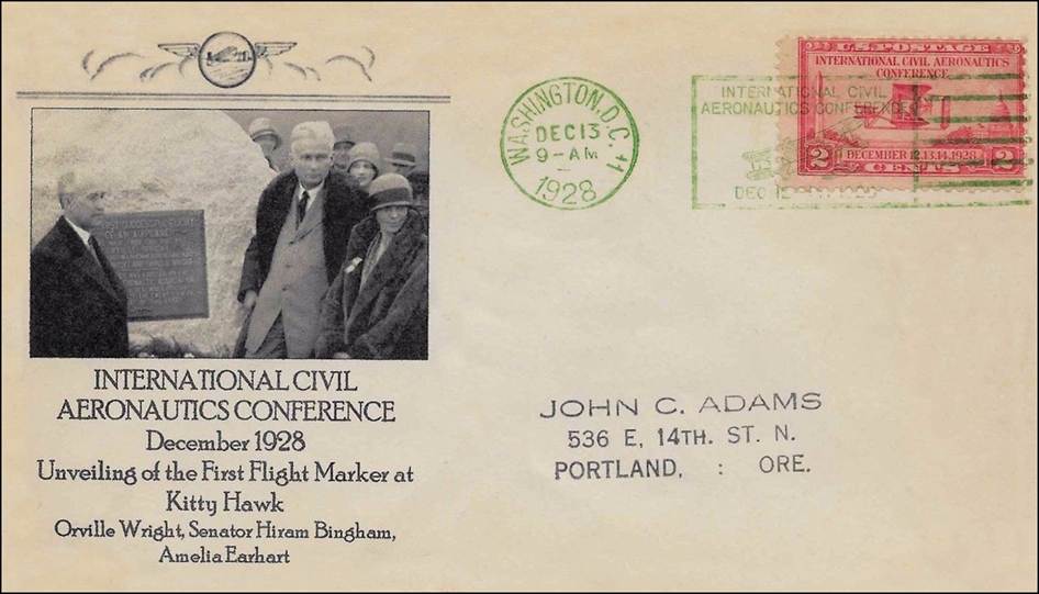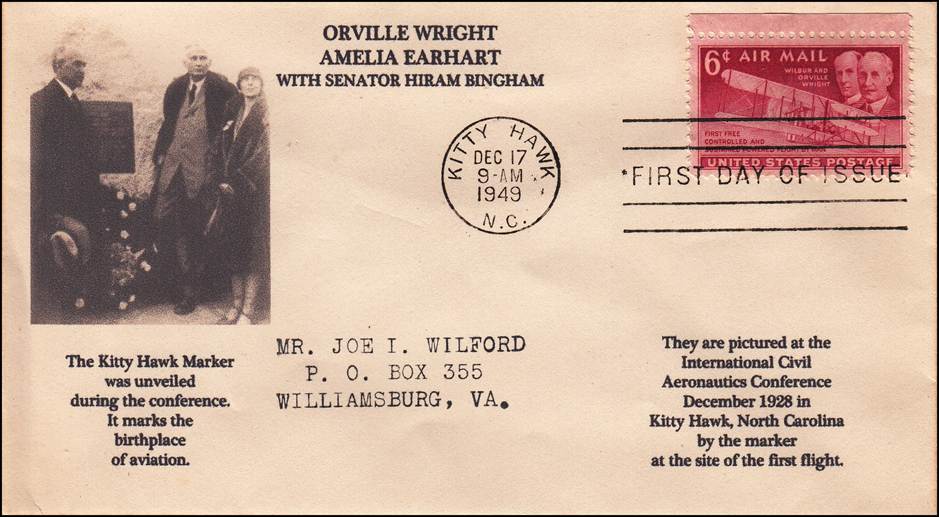 First Day Cover with cancel on 17 December 1949, commemorating the 50th anniversary of the Wright’s feat - Picture showing Orville Wright, President of the Aeronautics Association, Amelia Earhart, and Senator Hiram Bingham, Secretary of War Dwight F. Davis, pictured in front of the Kitty Hawk Marker unveiled during the International Civil Aeronautics Conference in 1928.