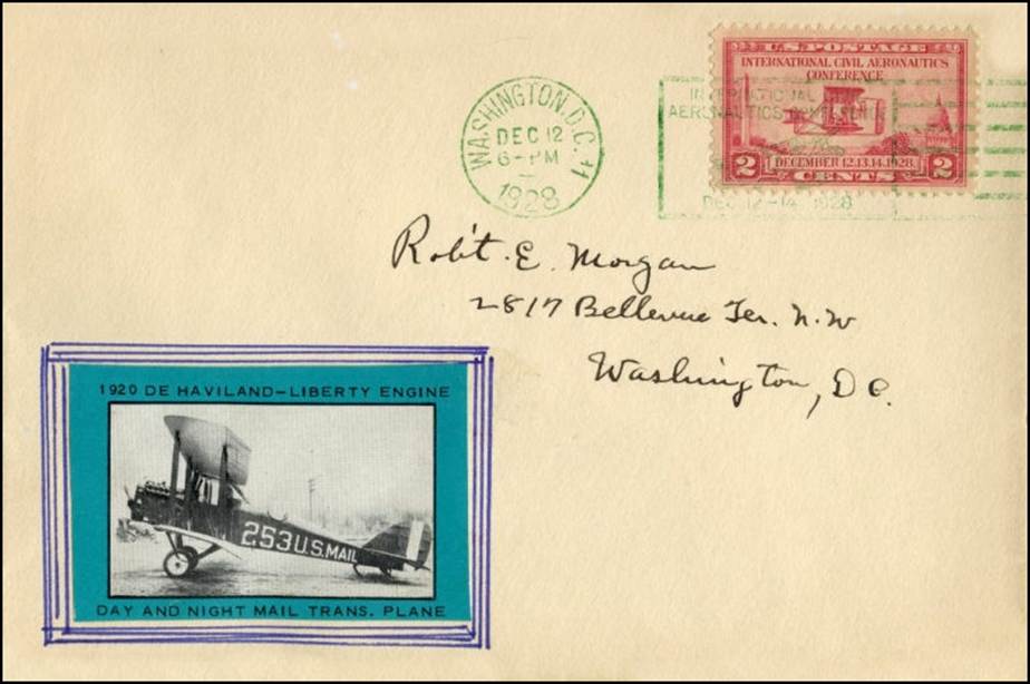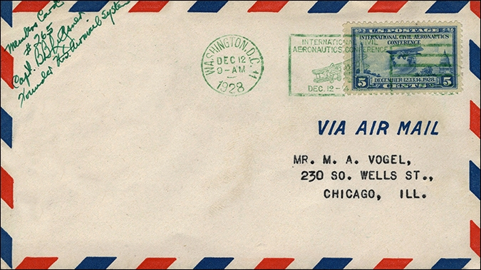 First day airmail cover (front and back) sent by Conference attendee Benjamin Lipsner, a retired army captain and pivotal figure in early U.S. airmail. His Delegate’s number was 265.