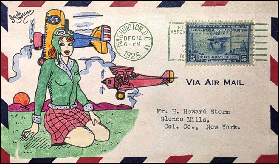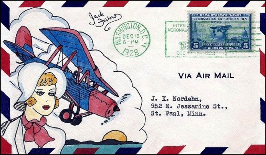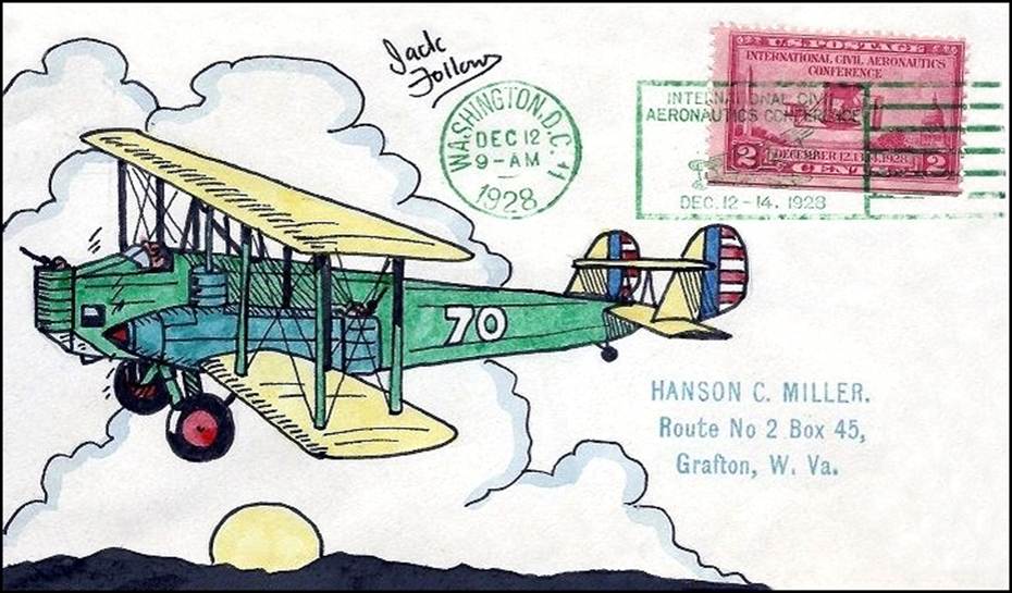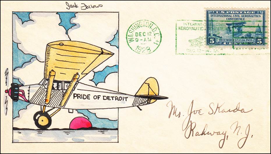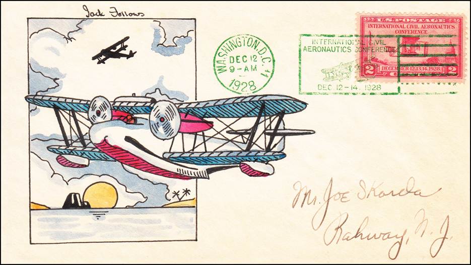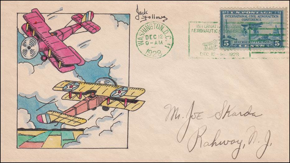 First Day Covers with hand-drawn and hand-painted cachets by Jack Follows. One-of-a-kind covers. On this totally awesome pairs of masterfully hand-drawn and lavishing hand-painted cachets, Jack Follows reminds us of the early days of air travel with his depiction of different vintage aircraft, single-wing and double-wing varieties, as they soar in the bountiful sky, which is punctuated with cotton-white clouds. The add-on cachets by Englishman, Jack Follows (1927-1997) are very popular with collectors. They do not appear in the marketplace very often. Follows was known for his cartoonlike cachets which combined the themes of women, aviation, and comic characters. Each cachet was unique in design. Several of these covers were sent to Joe Skarda. Joseph William Skarda (1906-1991) lived at Rahway, Union County, New Jersey.